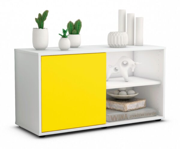 100% Hergestellt in Deutschland und mit Ökostrom produziert. Der Holzschrank überzeugt durch hochwertige Materialien sowie eine erstklassige und saubere Verarbeitung. Der Aufbau des Lowboards gestaltet sich aufgrund der Aufbauanleitung mit grafischen Darstellungen und Illustrationen einfach und schnell. Der Versand erfolgt innerhalb von 2-3 Werktagen. Dieses Lowboard hat Gesamt-Maße von 92x49x35cm. Viel Platz, eine leere Wand, kein passendes Möbelstück? Mit der Gesamtlänge von ca. 92 cm bietet dieser Schrank vielzählige Einsatzmöglichkeiten. Die Frontfarbe Sonnengelb verleiht Räumen Freude und positive Energie ohne diesen farblich zu überfluten. Der eher gelb pastell Ton verschafft eine frische Atmosphäre.Der weiße matte Korpus kann überall integriert werden. Mit der beruhigenden Farbe weiß, findet sich leicht Stellplatz für dieses schöne Möbelstück.