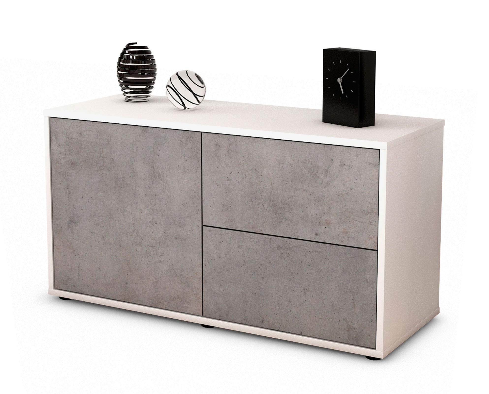 100% Hergestellt in Deutschland und mit Ökostrom produziert. Der Holzschrank überzeugt durch hochwertige Materialien sowie eine erstklassige und saubere Verarbeitung. Der Aufbau des Lowboards gestaltet sich aufgrund der Aufbauanleitung mit grafischen Darstellungen und Illustrationen einfach und schnell. Der Versand erfolgt innerhalb von 2-3 Werktagen. Dieses Lowboard hat Gesamt-Maße von 92x49x35cm. Viel Platz, eine leere Wand, kein passendes Möbelstück? Mit der Gesamtlänge von ca. 92 cm bietet dieser Schrank vielzählige Einsatzmöglichkeiten. Die Frontfarbe Beton wirkt zeitlos und hoch modern. Die steinähnliche Nachbildung zeigt sich als klassisch, stilvolles Grau meliert. Die Betonoptik im Industrie-Look liegt gerade voll im Trend. Der weiße matte Korpus kann überall integriert werden. Mit der beruhigenden Farbe weiß, findet sich leicht Stellplatz für dieses schöne Möbelstück.
