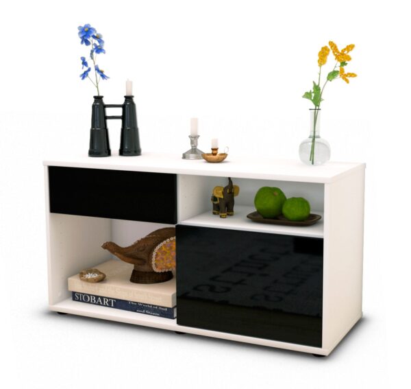 100% Hergestellt in Deutschland und mit Ökostrom produziert. Der Holzschrank überzeugt durch hochwertige Materialien sowie eine erstklassige und saubere Verarbeitung. Der Aufbau des Lowboards gestaltet sich aufgrund der Aufbauanleitung mit grafischen Darstellungen und Illustrationen einfach und schnell. Der Versand erfolgt innerhalb von 2-3 Werktagen. Dieses Lowboard hat Gesamt-Maße von 92x49x35cm. Viel Platz, eine leere Wand, kein passendes Möbelstück? Mit der Gesamtlänge von ca. 92 cm bietet dieser Schrank vielzählige Einsatzmöglichkeiten. Die Frontfarbe Hochglanz Schwarz ist eine der beliebtesten Möbelfarben. Glanz Dekore sind hoch modern und liegen immer im Trend. Die Front ist glänzend und und leicht spiegelnd. Der weiße matte Korpus kann überall integriert werden. Mit der beruhigenden Farbe weiß, findet sich leicht Stellplatz für dieses schöne Möbelstück.