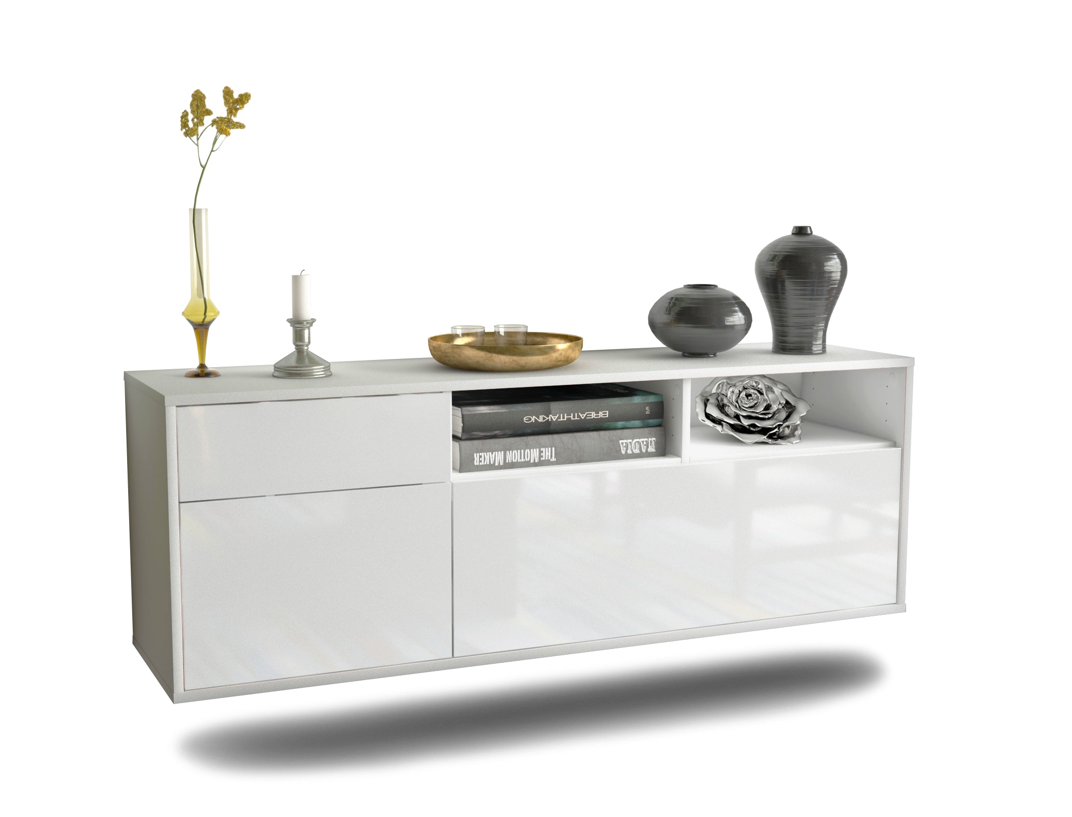 100% Hergestellt in Deutschland und mit Ökostrom produziert. Der Holzschrank überzeugt durch hochwertige Materialien sowie eine erstklassige und saubere Verarbeitung. Der Aufbau des Lowboards gestaltet sich aufgrund der Aufbauanleitung mit grafischen Darstellungen und Illustrationen einfach und schnell. Der Versand erfolgt innerhalb von 2-3 Werktagen. Dieses Lowboard hat Gesamt-Maße von 136x49x35cm. Viel Platz, eine leere Wand, kein passendes Möbelstück? Mit der Gesamtlänge von ca. 1,36 Meter bietet dieser Schrank vielzählige Einsatzmöglichkeiten. Die Frontfarbe Hochglanz Weiß bringt als reine und unschuldige Farbe Ruhe in jeden Raum. Mit dem Glanz Weiss erzeugt man einen hochwertigen glänzenden Kontrast zu dunklen Wänden. Der weiße matte Korpus kann überall integriert werden. Mit der beruhigenden Farbe weiß, findet sich leicht Stellplatz für dieses schöne Möbelstück.