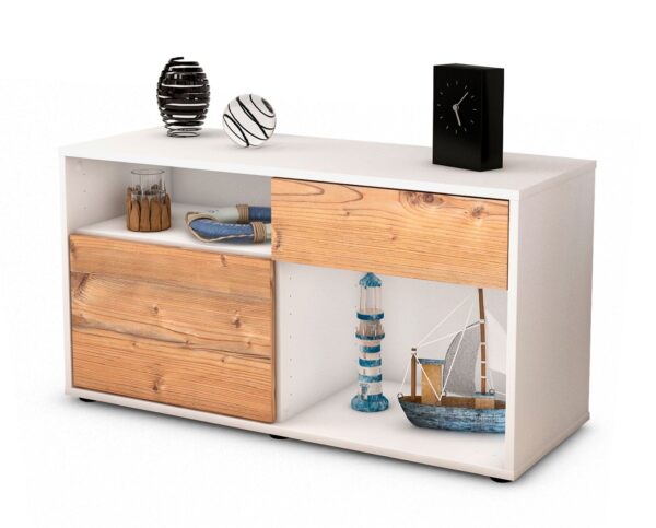 100% Hergestellt in Deutschland und mit Ökostrom produziert. Der Holzschrank überzeugt durch hochwertige Materialien sowie eine erstklassige und saubere Verarbeitung. Der Aufbau des Lowboards gestaltet sich aufgrund der Aufbauanleitung mit grafischen Darstellungen und Illustrationen einfach und schnell. Der Versand erfolgt innerhalb von 2-3 Werktagen. Dieses Lowboard hat Gesamt-Maße von 92x49x35cm. Viel Platz, eine leere Wand, kein passendes Möbelstück? Mit der Gesamtlänge von ca. 92 cm bietet dieser Schrank vielzählige Einsatzmöglichkeiten. Die Holz Front Pinie Nachbildung ist ein freundliches Braun mit farblich abgesetzter Holzmaserung. Die Integrierung in Wohnräume ist durch das warme Holz leicht möglich. Der weiße matte Korpus kann überall integriert werden. Mit der beruhigenden Farbe weiß, findet sich leicht Stellplatz für dieses schöne Möbelstück.