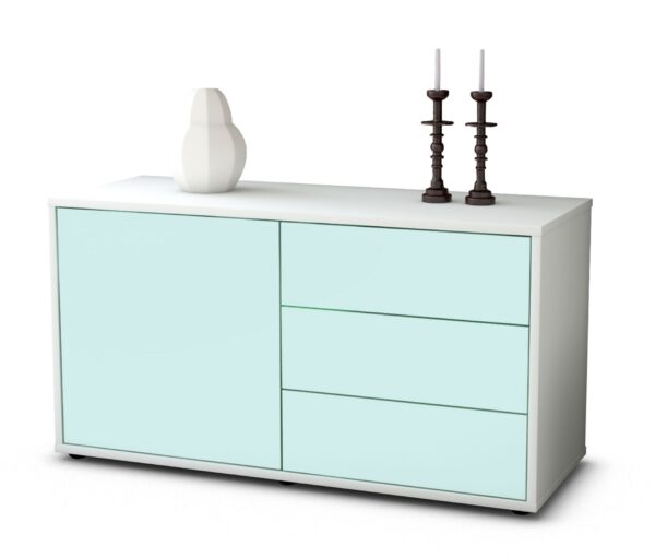 100% Hergestellt in Deutschland und mit Ökostrom produziert. Der Holzschrank überzeugt durch hochwertige Materialien sowie eine erstklassige und saubere Verarbeitung. Der Aufbau des Lowboards gestaltet sich aufgrund der Aufbauanleitung mit grafischen Darstellungen und Illustrationen einfach und schnell. Der Versand erfolgt innerhalb von 2-3 Werktagen. Dieses Lowboard hat Gesamt-Maße von 92x49x35cm. Viel Platz, eine leere Wand, kein passendes Möbelstück? Mit der Gesamtlänge von ca. 92 cm bietet dieser Schrank vielzählige Einsatzmöglichkeiten. Die Frontfarbe Eisblau verleiht Ihrem Raum Frische. Das Himmelblau fördert eine sanfte Atmosphäre. Die Farben Hellblau und Mint werden gerne für moderne Wohnräume verwendet. Der weiße matte Korpus kann überall integriert werden. Mit der beruhigenden Farbe weiß, findet sich leicht Stellplatz für dieses schöne Möbelstück.