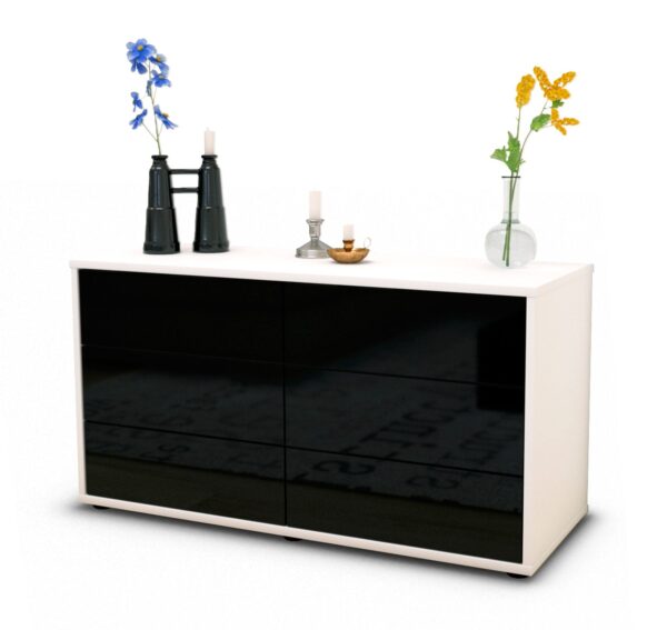 100% Hergestellt in Deutschland und mit Ökostrom produziert. Der Holzschrank überzeugt durch hochwertige Materialien sowie eine erstklassige und saubere Verarbeitung. Der Aufbau des Lowboards gestaltet sich aufgrund der Aufbauanleitung mit grafischen Darstellungen und Illustrationen einfach und schnell. Der Versand erfolgt innerhalb von 2-3 Werktagen. Dieses Lowboard hat Gesamt-Maße von 92x49x35cm. Viel Platz, eine leere Wand, kein passendes Möbelstück? Mit der Gesamtlänge von ca. 92 cm bietet dieser Schrank vielzählige Einsatzmöglichkeiten. Die Frontfarbe Hochglanz Schwarz ist eine der beliebtesten Möbelfarben. Glanz Dekore sind hoch modern und liegen immer im Trend. Die Front ist glänzend und und leicht spiegelnd. Der weiße matte Korpus kann überall integriert werden. Mit der beruhigenden Farbe weiß, findet sich leicht Stellplatz für dieses schöne Möbelstück.