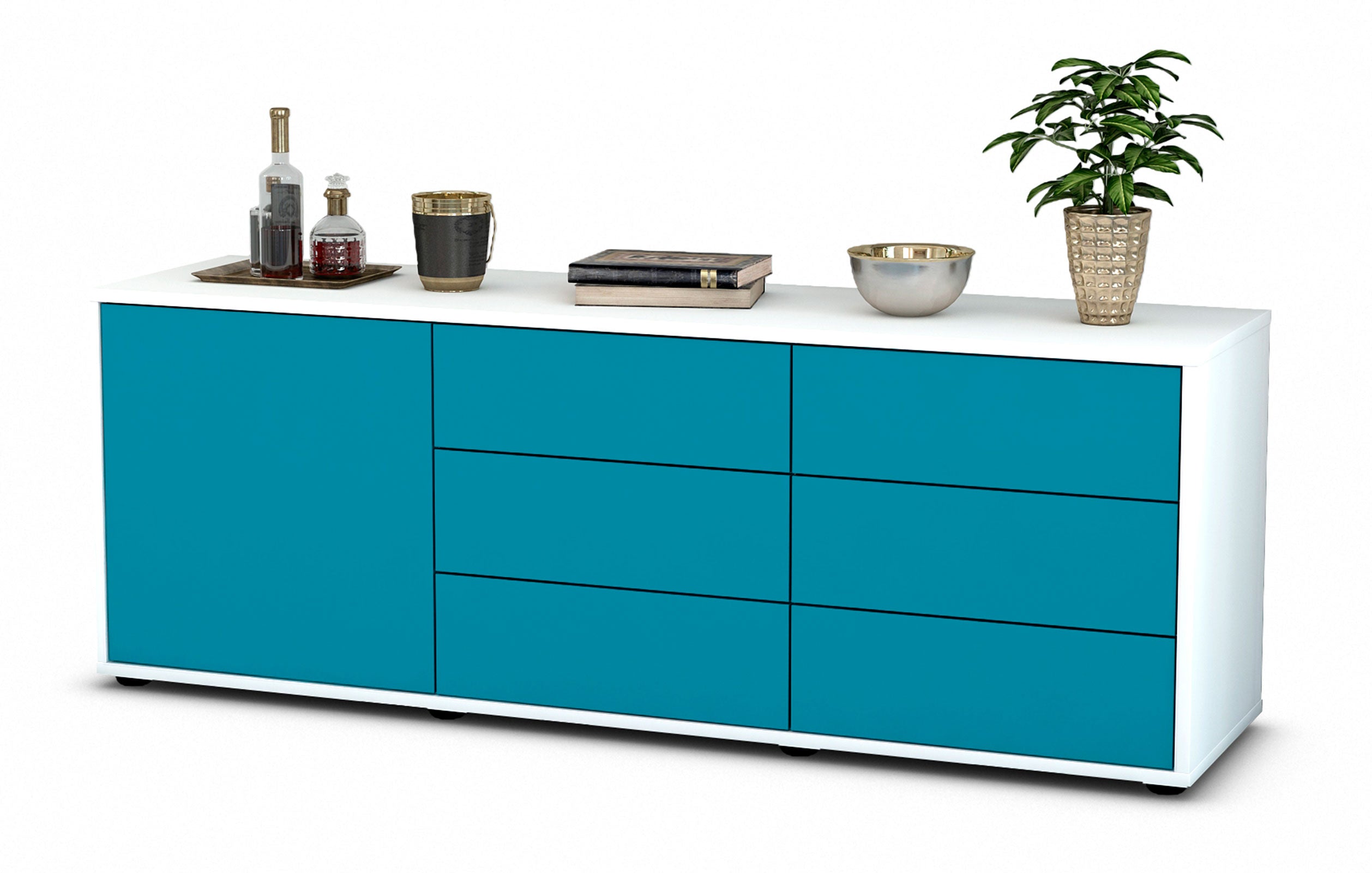 100% Hergestellt in Deutschland und mit Ökostrom produziert. Der Holzschrank überzeugt durch hochwertige Materialien sowie eine erstklassige und saubere Verarbeitung. Der Aufbau des Lowboards gestaltet sich aufgrund der Aufbauanleitung mit grafischen Darstellungen und Illustrationen einfach und schnell. Der Versand erfolgt innerhalb von 2-3 Werktagen. Dieses Lowboard hat Gesamt-Maße von 136x49x35cm. Viel Platz, eine leere Wand, kein passendes Möbelstück? Mit der Gesamtlänge von ca. 1,36 Meter bietet dieser Schrank vielzählige Einsatzmöglichkeiten. Die Frontfarbe im freundlichen Lagunenblau bringt das schöne Wetter in jedes Zuhause. Das intensive Türkis erinnert an die Karibik und schafft tagtägich einen zusätzlichen Erhoungsfaktor. Der weiße matte Korpus kann überall integriert werden. Mit der beruhigenden Farbe weiß, findet sich leicht Stellplatz für dieses schöne Möbelstück.