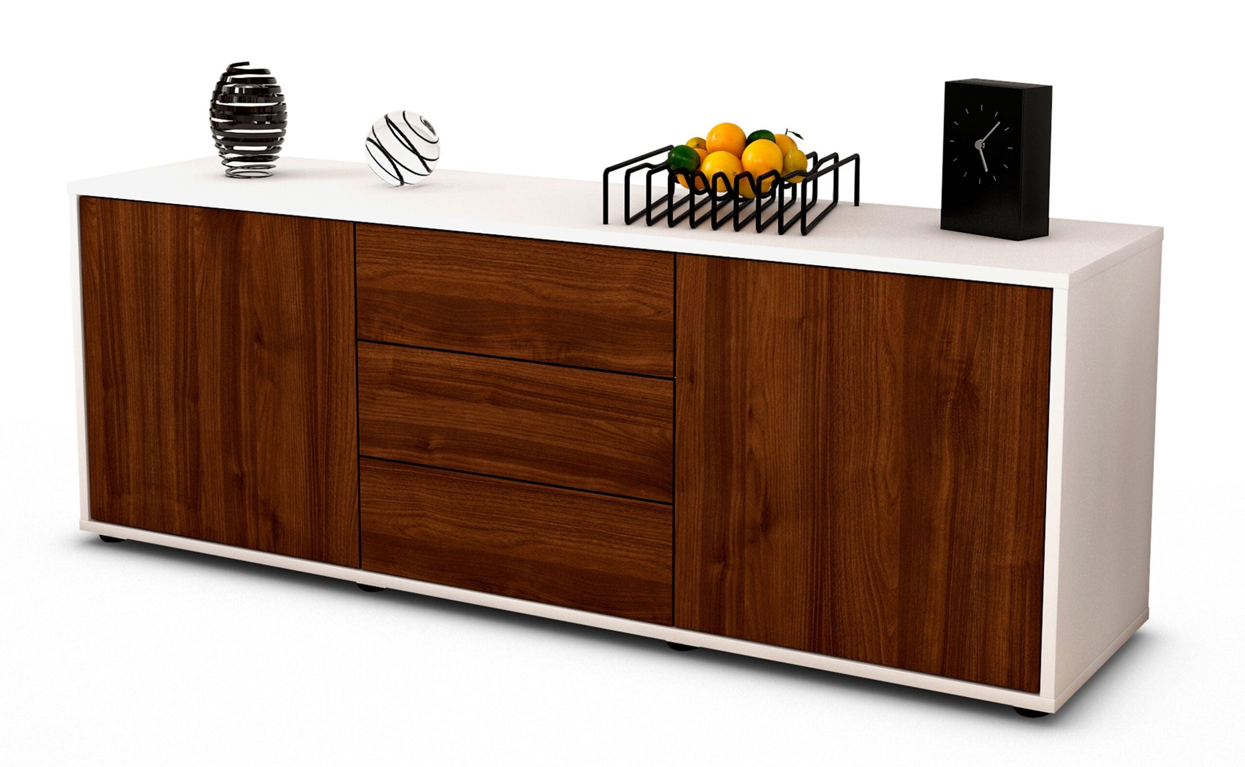 100% Hergestellt in Deutschland und mit Ökostrom produziert. Der Holzschrank überzeugt durch hochwertige Materialien sowie eine erstklassige und saubere Verarbeitung. Der Aufbau des Lowboards gestaltet sich aufgrund der Aufbauanleitung mit grafischen Darstellungen und Illustrationen einfach und schnell. Der Versand erfolgt innerhalb von 2-3 Werktagen. Dieses Lowboard hat Gesamt-Maße von 136x49x35cm. Viel Platz, eine leere Wand, kein passendes Möbelstück? Mit der Gesamtlänge von ca. 1,36 Meter bietet dieser Schrank vielzählige Einsatzmöglichkeiten. Die Holz Front Walnuss Nachbildung wirkt mit einem dunklen und intensiven Braun sehr einladend. Das dunkel erscheinende Holz passt sehr gut zu einem gemütlichen Einrichtungsstil. Der weiße matte Korpus kann überall integriert werden. Mit der beruhigenden Farbe weiß, findet sich leicht Stellplatz für dieses schöne Möbelstück.