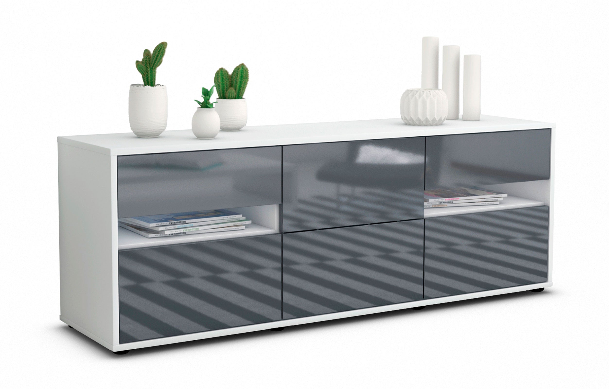 100% Hergestellt in Deutschland und mit Ökostrom produziert. Der Holzschrank überzeugt durch hochwertige Materialien sowie eine erstklassige und saubere Verarbeitung. Der Aufbau des Lowboards gestaltet sich aufgrund der Aufbauanleitung mit grafischen Darstellungen und Illustrationen einfach und schnell. Der Versand erfolgt innerhalb von 2-3 Werktagen. Dieses Lowboard hat Gesamt-Maße von 136x49x35cm. Viel Platz, eine leere Wand, kein passendes Möbelstück? Mit der Gesamtlänge von ca. 1,36 Meter bietet dieser Schrank vielzählige Einsatzmöglichkeiten. Die Frontfarbe Hochglanz Graphit Grau ist zeitlos, schlicht und daher für jeden Wohnbereich glänzend geeignet. Anthrazit, dunkelgrau oder granit – diese Farbtöne bringen Stil & Glanz. Der weiße matte Korpus kann überall integriert werden. Mit der beruhigenden Farbe weiß, findet sich leicht Stellplatz für dieses schöne Möbelstück.