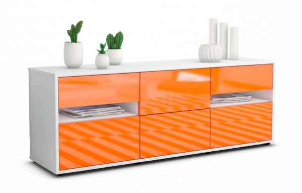 100% Hergestellt in Deutschland und mit Ökostrom produziert. Der Holzschrank überzeugt durch hochwertige Materialien sowie eine erstklassige und saubere Verarbeitung. Der Aufbau des Lowboards gestaltet sich aufgrund der Aufbauanleitung mit grafischen Darstellungen und Illustrationen einfach und schnell. Der Versand erfolgt innerhalb von 2-3 Werktagen. Dieses Lowboard hat Gesamt-Maße von 136x49x35cm. Viel Platz, eine leere Wand, kein passendes Möbelstück? Mit der Gesamtlänge von ca. 1,36 Meter bietet dieser Schrank vielzählige Einsatzmöglichkeiten. Die Frontfarbe Hochglanz Mandarine überzeugt durch ein intensives Orange mit tollem Glanz. Fröhlich und gläzend wird diese Farbe jeden Raum für sich einehmen. Der weiße matte Korpus kann überall integriert werden. Mit der beruhigenden Farbe weiß, findet sich leicht Stellplatz für dieses schöne Möbelstück.