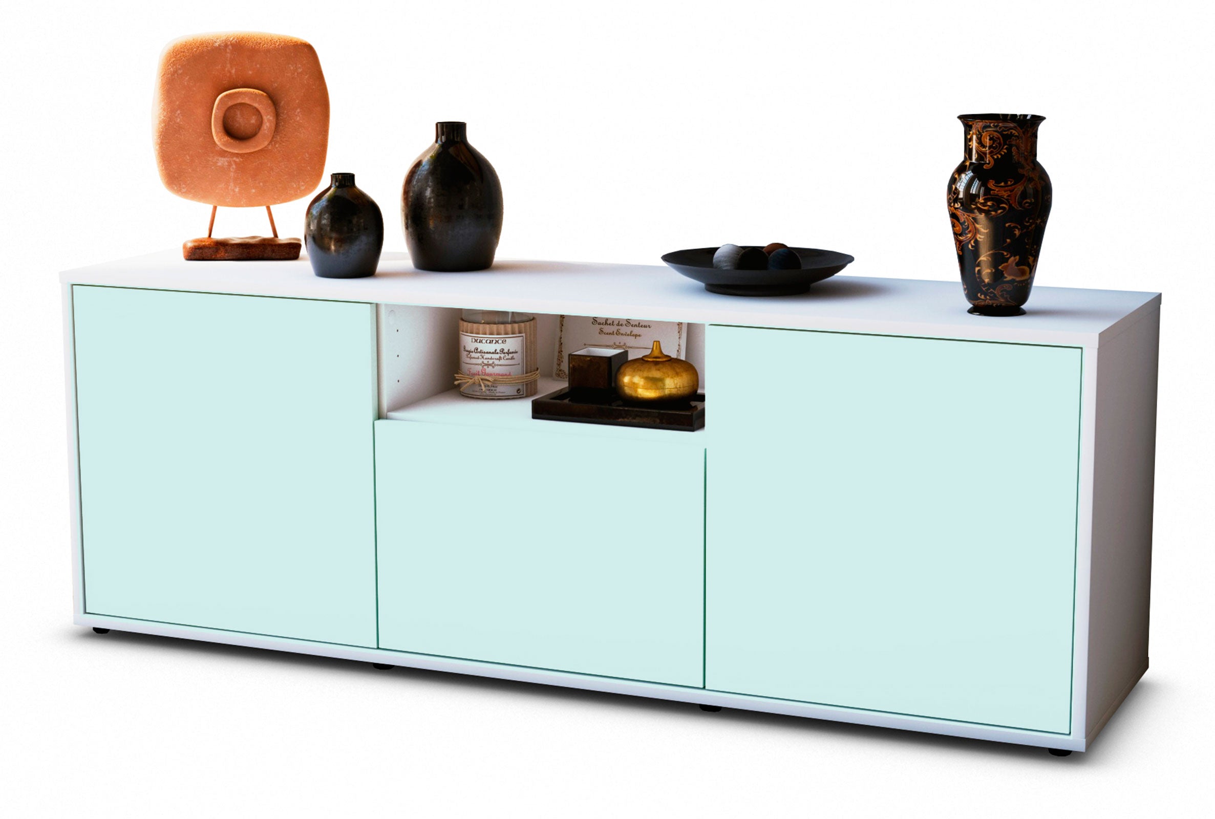100% Hergestellt in Deutschland und mit Ökostrom produziert. Der Holzschrank überzeugt durch hochwertige Materialien sowie eine erstklassige und saubere Verarbeitung. Der Aufbau des Lowboards gestaltet sich aufgrund der Aufbauanleitung mit grafischen Darstellungen und Illustrationen einfach und schnell. Der Versand erfolgt innerhalb von 2-3 Werktagen. Dieses Lowboard hat Gesamt-Maße von 136x49x35cm. Viel Platz, eine leere Wand, kein passendes Möbelstück? Mit der Gesamtlänge von ca. 1,36 Meter bietet dieser Schrank vielzählige Einsatzmöglichkeiten. Die Frontfarbe Eisblau verleiht Ihrem Raum Frische. Das Himmelblau fördert eine sanfte Atmosphäre. Die Farben Hellblau und Mint werden gerne für moderne Wohnräume verwendet. Der weiße matte Korpus kann überall integriert werden. Mit der beruhigenden Farbe weiß, findet sich leicht Stellplatz für dieses schöne Möbelstück.