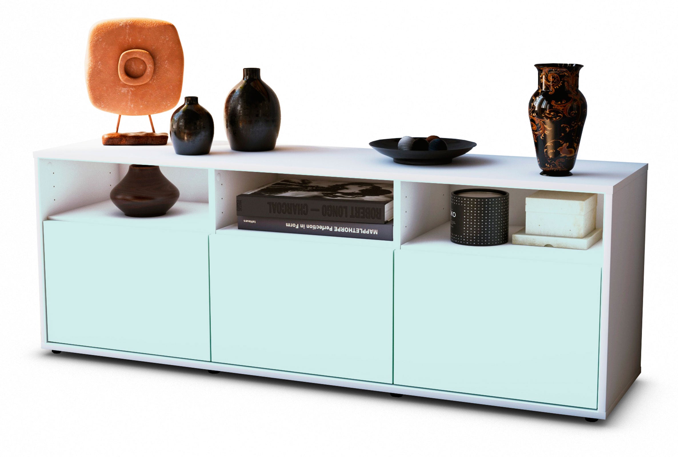 100% Hergestellt in Deutschland und mit Ökostrom produziert. Der Holzschrank überzeugt durch hochwertige Materialien sowie eine erstklassige und saubere Verarbeitung. Der Aufbau des Lowboards gestaltet sich aufgrund der Aufbauanleitung mit grafischen Darstellungen und Illustrationen einfach und schnell. Der Versand erfolgt innerhalb von 2-3 Werktagen. Dieses Lowboard hat Gesamt-Maße von 136x49x35cm. Viel Platz, eine leere Wand, kein passendes Möbelstück? Mit der Gesamtlänge von ca. 1,36 Meter bietet dieser Schrank vielzählige Einsatzmöglichkeiten. Die Frontfarbe Eisblau verleiht Ihrem Raum Frische. Das Himmelblau fördert eine sanfte Atmosphäre. Die Farben Hellblau und Mint werden gerne für moderne Wohnräume verwendet. Der weiße matte Korpus kann überall integriert werden. Mit der beruhigenden Farbe weiß, findet sich leicht Stellplatz für dieses schöne Möbelstück.