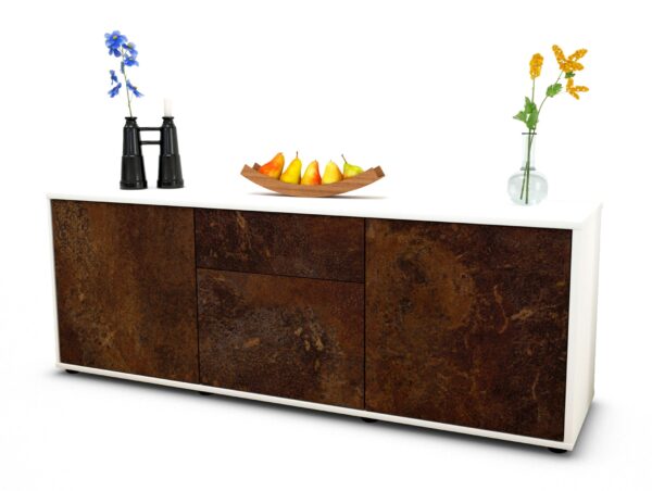 100% Hergestellt in Deutschland und mit Ökostrom produziert. Der Holzschrank überzeugt durch hochwertige Materialien sowie eine erstklassige und saubere Verarbeitung. Der Aufbau des Lowboards gestaltet sich aufgrund der Aufbauanleitung mit grafischen Darstellungen und Illustrationen einfach und schnell. Der Versand erfolgt innerhalb von 2-3 Werktagen. Dieses Lowboard hat Gesamt-Maße von 136x49x35cm. Viel Platz, eine leere Wand, kein passendes Möbelstück? Mit der Gesamtlänge von ca. 1,36 Meter bietet dieser Schrank vielzählige Einsatzmöglichkeiten. Die Frontfarbe Rost wirkt antik und verleiht einen Retro Industrie-Look. Die Darstellung von alten, verwitterten oder verrosteten Metall / Eisen wirkt Rot-Braun bzw. Bronze-Farben. Der weiße matte Korpus kann überall integriert werden. Mit der beruhigenden Farbe weiß, findet sich leicht Stellplatz für dieses schöne Möbelstück.