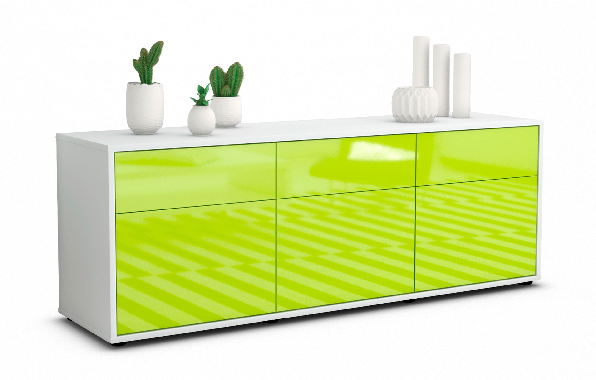 100% Hergestellt in Deutschland und mit Ökostrom produziert. Der Holzschrank überzeugt durch hochwertige Materialien sowie eine erstklassige und saubere Verarbeitung. Der Aufbau des Lowboards gestaltet sich aufgrund der Aufbauanleitung mit grafischen Darstellungen und Illustrationen einfach und schnell. Der Versand erfolgt innerhalb von 2-3 Werktagen. Dieses Lowboard hat Gesamt-Maße von 136x49x35cm. Viel Platz, eine leere Wand, kein passendes Möbelstück? Mit der Gesamtlänge von ca. 1,36 Meter bietet dieser Schrank vielzählige Einsatzmöglichkeiten. Die Frontfarbe Hochglanz Limettengrün bringt Schwung, Glanz und Farbe in jede Wohnung. Das knallig, leuchtende grün ist glänzend und wirkt wie ein frisches Apfelgrün oder eine saftige Limette. Der weiße matte Korpus kann überall integriert werden. Mit der beruhigenden Farbe weiß, findet sich leicht Stellplatz für dieses schöne Möbelstück.