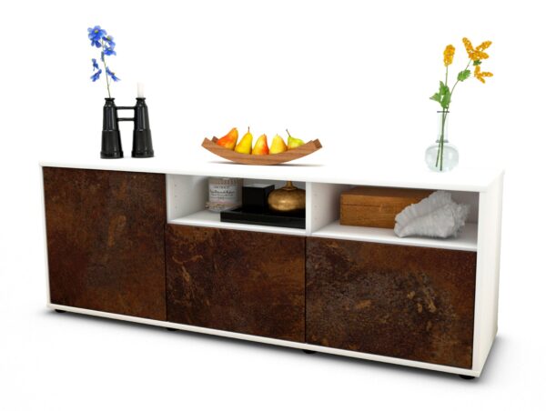 100% Hergestellt in Deutschland und mit Ökostrom produziert. Der Holzschrank überzeugt durch hochwertige Materialien sowie eine erstklassige und saubere Verarbeitung. Der Aufbau des Lowboards gestaltet sich aufgrund der Aufbauanleitung mit grafischen Darstellungen und Illustrationen einfach und schnell. Der Versand erfolgt innerhalb von 2-3 Werktagen. Dieses Lowboard hat Gesamt-Maße von 136x49x35cm. Viel Platz, eine leere Wand, kein passendes Möbelstück? Mit der Gesamtlänge von ca. 1,36 Meter bietet dieser Schrank vielzählige Einsatzmöglichkeiten. Die Frontfarbe Rost wirkt antik und verleiht einen Retro Industrie-Look. Die Darstellung von alten, verwitterten oder verrosteten Metall / Eisen wirkt Rot-Braun bzw. Bronze-Farben. Der weiße matte Korpus kann überall integriert werden. Mit der beruhigenden Farbe weiß, findet sich leicht Stellplatz für dieses schöne Möbelstück.