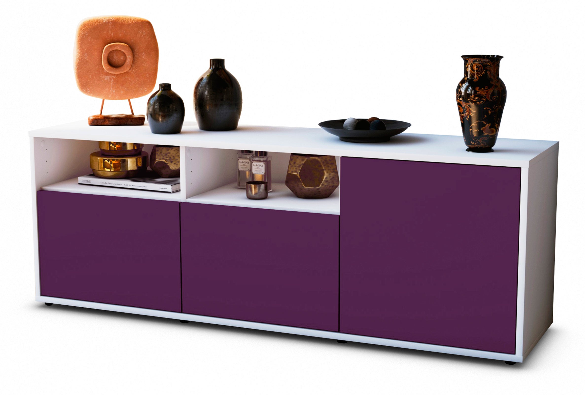 100% Hergestellt in Deutschland und mit Ökostrom produziert. Der Holzschrank überzeugt durch hochwertige Materialien sowie eine erstklassige und saubere Verarbeitung. Der Aufbau des Lowboards gestaltet sich aufgrund der Aufbauanleitung mit grafischen Darstellungen und Illustrationen einfach und schnell. Der Versand erfolgt innerhalb von 2-3 Werktagen. Dieses Lowboard hat Gesamt-Maße von 136x49x35cm. Viel Platz, eine leere Wand, kein passendes Möbelstück? Mit der Gesamtlänge von ca. 1,36 Meter bietet dieser Schrank vielzählige Einsatzmöglichkeiten. Die Frontfarbe im kräftigen Aubergine wirkt als Farbtupfer in allen Räumlichkeiten. Lila, violett und Brombeer Töne versprühen Glamour und Eleganz. Der weiße matte Korpus kann überall integriert werden. Mit der beruhigenden Farbe weiß, findet sich leicht Stellplatz für dieses schöne Möbelstück.