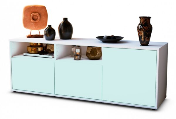 100% Hergestellt in Deutschland und mit Ökostrom produziert. Der Holzschrank überzeugt durch hochwertige Materialien sowie eine erstklassige und saubere Verarbeitung. Der Aufbau des Lowboards gestaltet sich aufgrund der Aufbauanleitung mit grafischen Darstellungen und Illustrationen einfach und schnell. Der Versand erfolgt innerhalb von 2-3 Werktagen. Dieses Lowboard hat Gesamt-Maße von 136x49x35cm. Viel Platz, eine leere Wand, kein passendes Möbelstück? Mit der Gesamtlänge von ca. 1,36 Meter bietet dieser Schrank vielzählige Einsatzmöglichkeiten. Die Frontfarbe Eisblau verleiht Ihrem Raum Frische. Das Himmelblau fördert eine sanfte Atmosphäre. Die Farben Hellblau und Mint werden gerne für moderne Wohnräume verwendet. Der weiße matte Korpus kann überall integriert werden. Mit der beruhigenden Farbe weiß, findet sich leicht Stellplatz für dieses schöne Möbelstück.