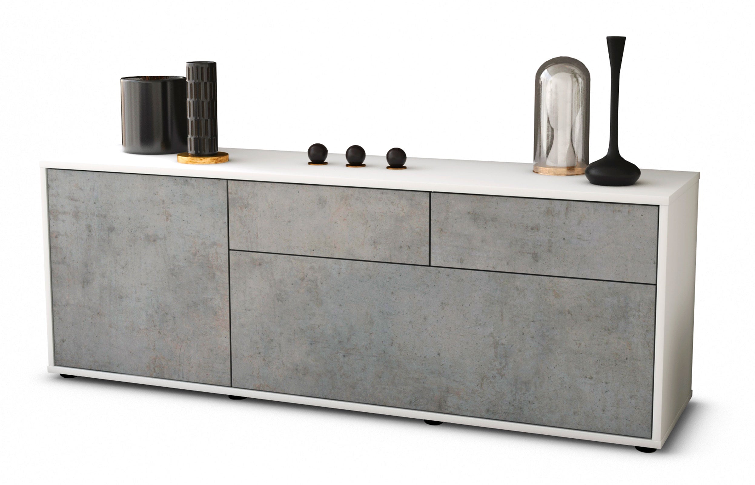 100% Hergestellt in Deutschland und mit Ökostrom produziert. Der Holzschrank überzeugt durch hochwertige Materialien sowie eine erstklassige und saubere Verarbeitung. Der Aufbau des Lowboards gestaltet sich aufgrund der Aufbauanleitung mit grafischen Darstellungen und Illustrationen einfach und schnell. Der Versand erfolgt innerhalb von 2-3 Werktagen. Dieses Lowboard hat Gesamt-Maße von 136x49x35cm. Viel Platz, eine leere Wand, kein passendes Möbelstück? Mit der Gesamtlänge von ca. 1,36 Meter bietet dieser Schrank vielzählige Einsatzmöglichkeiten. Die Frontfarbe Beton wirkt zeitlos und hoch modern. Die steinähnliche Nachbildung zeigt sich als klassisch, stilvolles Grau meliert. Die Betonoptik im Industrie-Look liegt gerade voll im Trend. Der weiße matte Korpus kann überall integriert werden. Mit der beruhigenden Farbe weiß, findet sich leicht Stellplatz für dieses schöne Möbelstück.