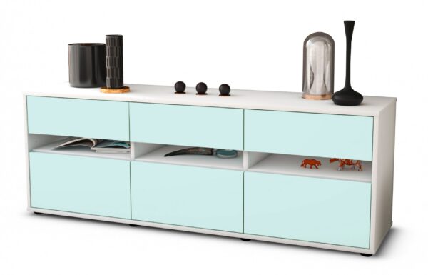 100% Hergestellt in Deutschland und mit Ökostrom produziert. Der Holzschrank überzeugt durch hochwertige Materialien sowie eine erstklassige und saubere Verarbeitung. Der Aufbau des Lowboards gestaltet sich aufgrund der Aufbauanleitung mit grafischen Darstellungen und Illustrationen einfach und schnell. Der Versand erfolgt innerhalb von 2-3 Werktagen. Dieses Lowboard hat Gesamt-Maße von 136x49x35cm. Viel Platz, eine leere Wand, kein passendes Möbelstück? Mit der Gesamtlänge von ca. 1,36 Meter bietet dieser Schrank vielzählige Einsatzmöglichkeiten. Die Frontfarbe Eisblau verleiht Ihrem Raum Frische. Das Himmelblau fördert eine sanfte Atmosphäre. Die Farben Hellblau und Mint werden gerne für moderne Wohnräume verwendet. Der weiße matte Korpus kann überall integriert werden. Mit der beruhigenden Farbe weiß, findet sich leicht Stellplatz für dieses schöne Möbelstück.
