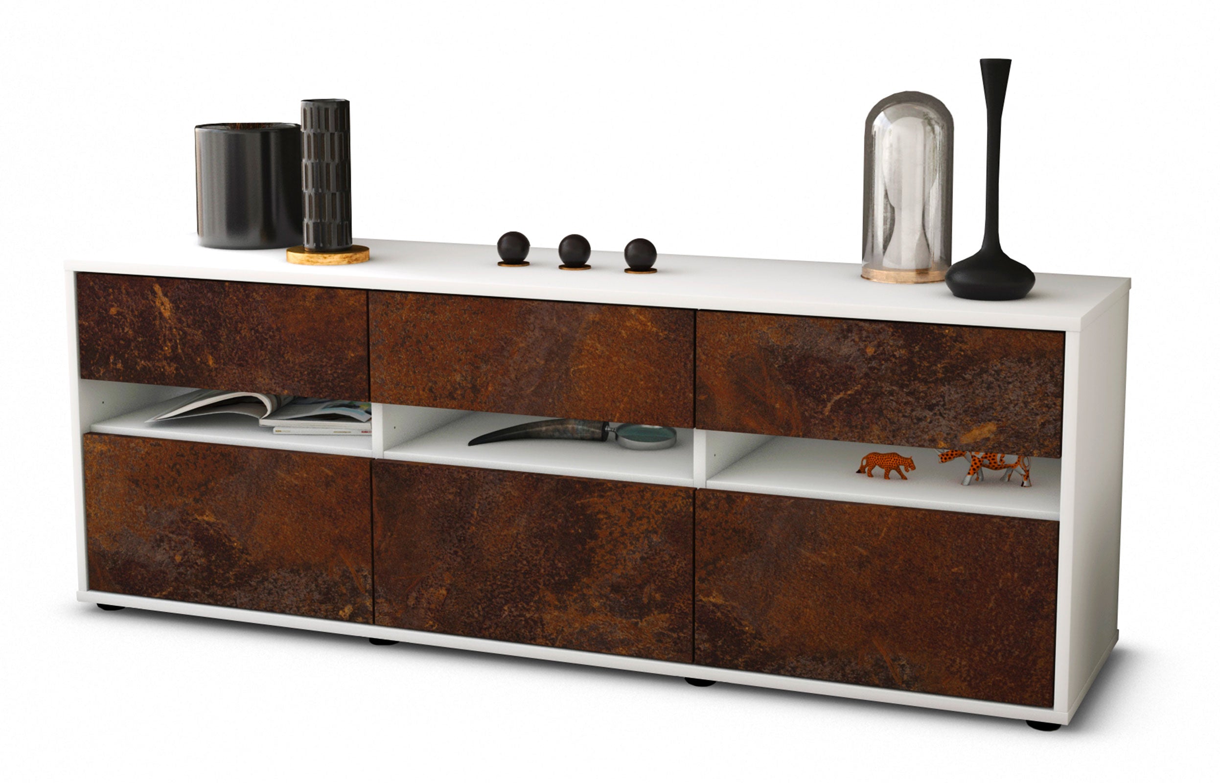 100% Hergestellt in Deutschland und mit Ökostrom produziert. Der Holzschrank überzeugt durch hochwertige Materialien sowie eine erstklassige und saubere Verarbeitung. Der Aufbau des Lowboards gestaltet sich aufgrund der Aufbauanleitung mit grafischen Darstellungen und Illustrationen einfach und schnell. Der Versand erfolgt innerhalb von 2-3 Werktagen. Dieses Lowboard hat Gesamt-Maße von 136x49x35cm. Viel Platz, eine leere Wand, kein passendes Möbelstück? Mit der Gesamtlänge von ca. 1,36 Meter bietet dieser Schrank vielzählige Einsatzmöglichkeiten. Die Frontfarbe Rost wirkt antik und verleiht einen Retro Industrie-Look. Die Darstellung von alten, verwitterten oder verrosteten Metall / Eisen wirkt Rot-Braun bzw. Bronze-Farben. Der weiße matte Korpus kann überall integriert werden. Mit der beruhigenden Farbe weiß, findet sich leicht Stellplatz für dieses schöne Möbelstück.