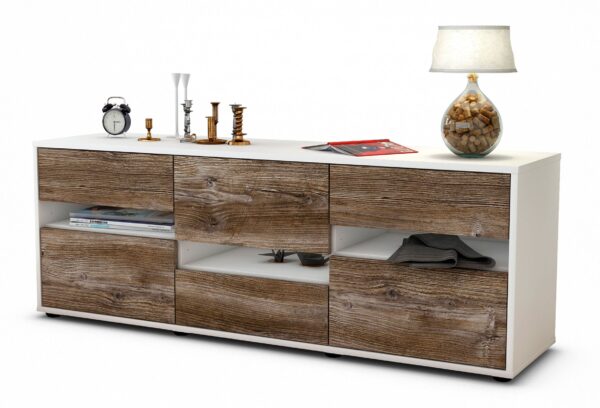 100% Hergestellt in Deutschland und mit Ökostrom produziert. Der Holzschrank überzeugt durch hochwertige Materialien sowie eine erstklassige und saubere Verarbeitung. Der Aufbau des Lowboards gestaltet sich aufgrund der Aufbauanleitung mit grafischen Darstellungen und Illustrationen einfach und schnell. Der Versand erfolgt innerhalb von 2-3 Werktagen. Dieses Lowboard hat Gesamt-Maße von 136x49x35cm. Viel Platz, eine leere Wand, kein passendes Möbelstück? Mit der Gesamtlänge von ca. 1,36 Meter bietet dieser Schrank vielzählige Einsatzmöglichkeiten. Die Holz Front Treibholz Nachbildung ist ein gemütliches, dunkel grau mit einer schönen abgesetzten Holzmaserung. Das rustikale Holz strahlt Ruhe und Geborgenheit aus. Der weiße matte Korpus kann überall integriert werden. Mit der beruhigenden Farbe weiß, findet sich leicht Stellplatz für dieses schöne Möbelstück.