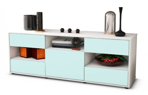 100% Hergestellt in Deutschland und mit Ökostrom produziert. Der Holzschrank überzeugt durch hochwertige Materialien sowie eine erstklassige und saubere Verarbeitung. Der Aufbau des Lowboards gestaltet sich aufgrund der Aufbauanleitung mit grafischen Darstellungen und Illustrationen einfach und schnell. Der Versand erfolgt innerhalb von 2-3 Werktagen. Dieses Lowboard hat Gesamt-Maße von 136x49x35cm. Viel Platz, eine leere Wand, kein passendes Möbelstück? Mit der Gesamtlänge von ca. 1,36 Meter bietet dieser Schrank vielzählige Einsatzmöglichkeiten. Die Frontfarbe Eisblau verleiht Ihrem Raum Frische. Das Himmelblau fördert eine sanfte Atmosphäre. Die Farben Hellblau und Mint werden gerne für moderne Wohnräume verwendet. Der weiße matte Korpus kann überall integriert werden. Mit der beruhigenden Farbe weiß, findet sich leicht Stellplatz für dieses schöne Möbelstück.