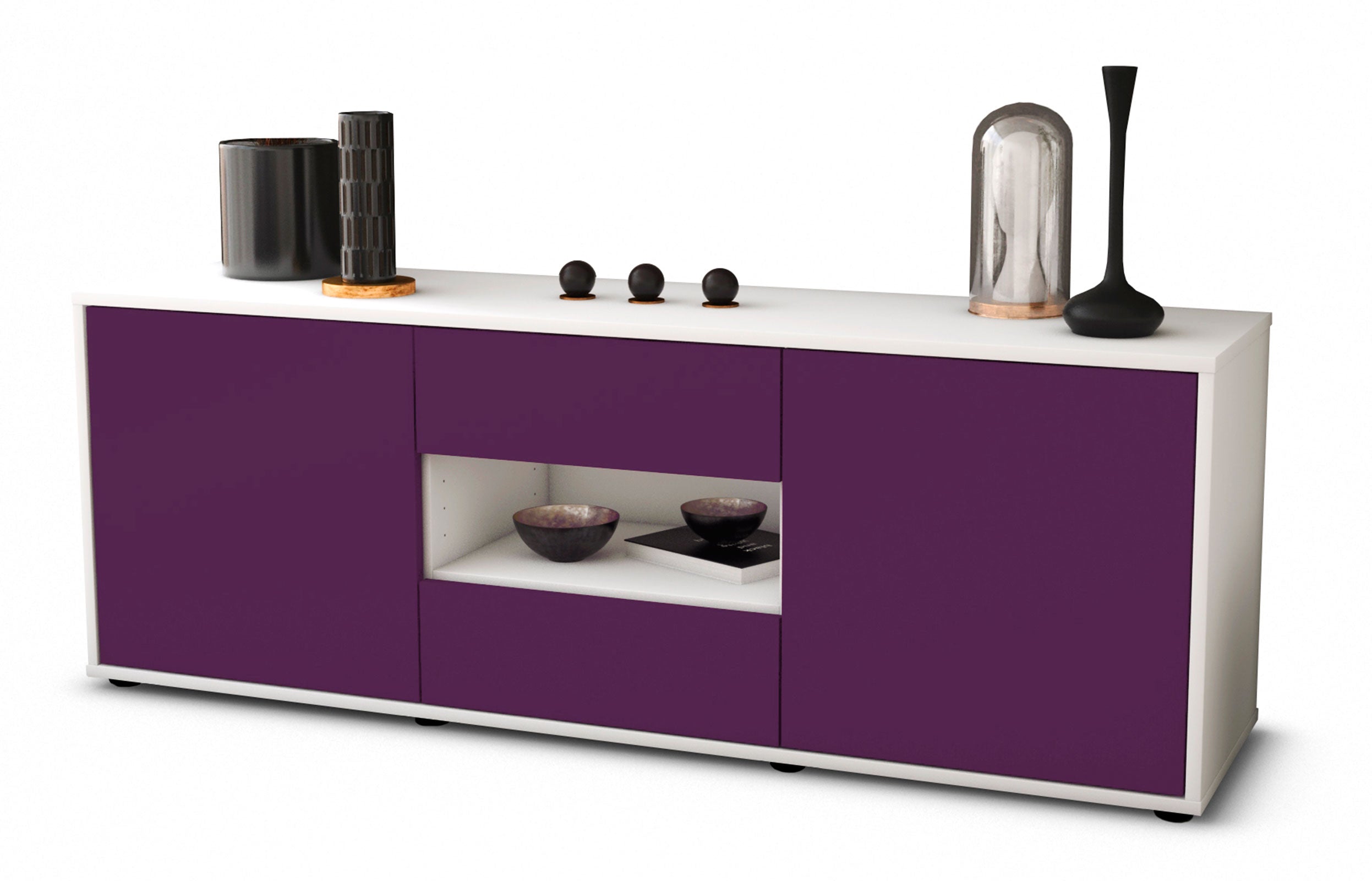 100% Hergestellt in Deutschland und mit Ökostrom produziert. Der Holzschrank überzeugt durch hochwertige Materialien sowie eine erstklassige und saubere Verarbeitung. Der Aufbau des Lowboards gestaltet sich aufgrund der Aufbauanleitung mit grafischen Darstellungen und Illustrationen einfach und schnell. Der Versand erfolgt innerhalb von 2-3 Werktagen. Dieses Lowboard hat Gesamt-Maße von 136x49x35cm. Viel Platz, eine leere Wand, kein passendes Möbelstück? Mit der Gesamtlänge von ca. 1,36 Meter bietet dieser Schrank vielzählige Einsatzmöglichkeiten. Die Frontfarbe im kräftigen Aubergine wirkt als Farbtupfer in allen Räumlichkeiten. Lila, violett und Brombeer Töne versprühen Glamour und Eleganz. Der weiße matte Korpus kann überall integriert werden. Mit der beruhigenden Farbe weiß, findet sich leicht Stellplatz für dieses schöne Möbelstück.