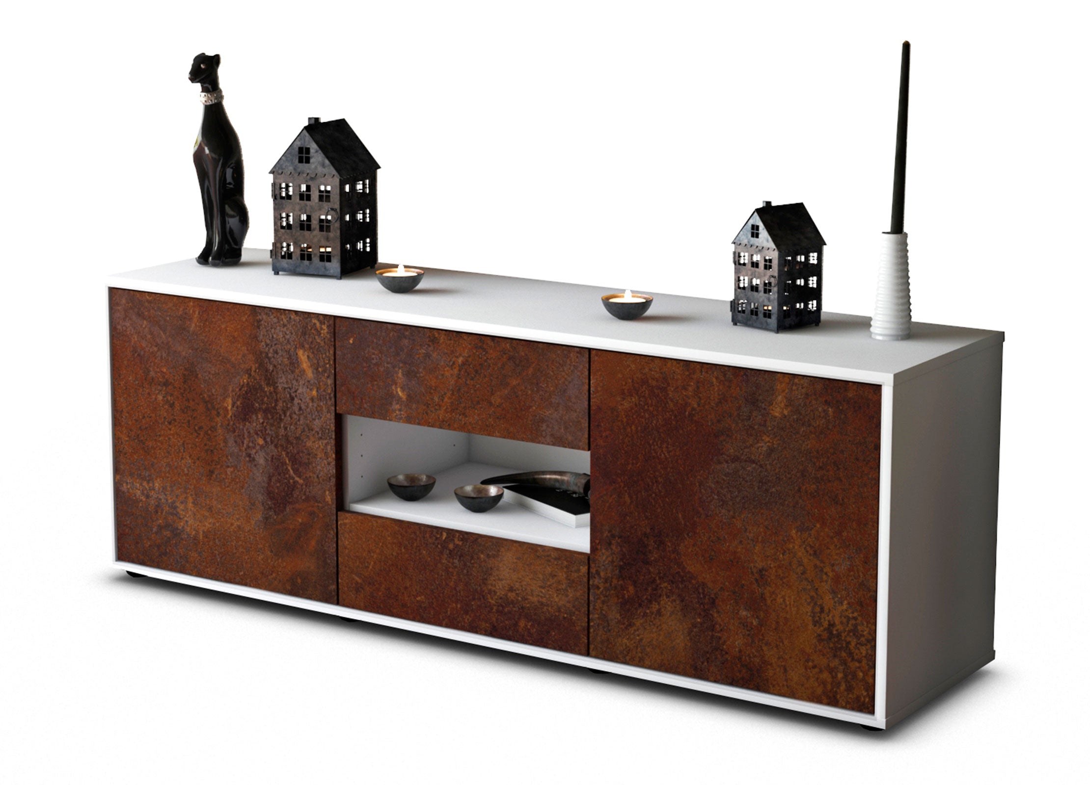 100% Hergestellt in Deutschland und mit Ökostrom produziert. Der Holzschrank überzeugt durch hochwertige Materialien sowie eine erstklassige und saubere Verarbeitung. Der Aufbau des Lowboards gestaltet sich aufgrund der Aufbauanleitung mit grafischen Darstellungen und Illustrationen einfach und schnell. Der Versand erfolgt innerhalb von 2-3 Werktagen. Dieses Lowboard hat Gesamt-Maße von 136x49x35cm. Viel Platz, eine leere Wand, kein passendes Möbelstück? Mit der Gesamtlänge von ca. 1,36 Meter bietet dieser Schrank vielzählige Einsatzmöglichkeiten. Die Frontfarbe Rost wirkt antik und verleiht einen Retro Industrie-Look. Die Darstellung von alten, verwitterten oder verrosteten Metall / Eisen wirkt Rot-Braun bzw. Bronze-Farben. Der weiße matte Korpus kann überall integriert werden. Mit der beruhigenden Farbe weiß, findet sich leicht Stellplatz für dieses schöne Möbelstück.