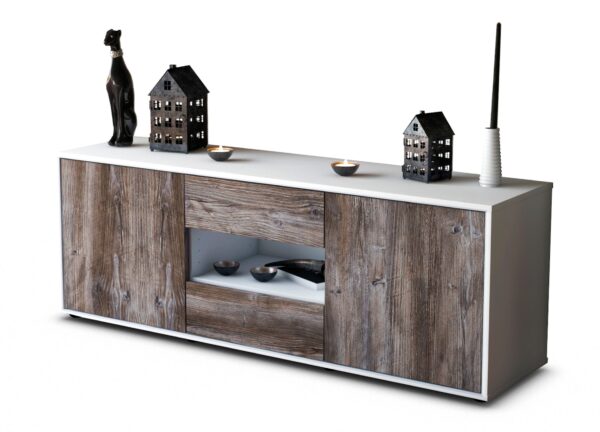 100% Hergestellt in Deutschland und mit Ökostrom produziert. Der Holzschrank überzeugt durch hochwertige Materialien sowie eine erstklassige und saubere Verarbeitung. Der Aufbau des Lowboards gestaltet sich aufgrund der Aufbauanleitung mit grafischen Darstellungen und Illustrationen einfach und schnell. Der Versand erfolgt innerhalb von 2-3 Werktagen. Dieses Lowboard hat Gesamt-Maße von 136x49x35cm. Viel Platz, eine leere Wand, kein passendes Möbelstück? Mit der Gesamtlänge von ca. 1,36 Meter bietet dieser Schrank vielzählige Einsatzmöglichkeiten. Die Holz Front Treibholz Nachbildung ist ein gemütliches, dunkel grau mit einer schönen abgesetzten Holzmaserung. Das rustikale Holz strahlt Ruhe und Geborgenheit aus. Der weiße matte Korpus kann überall integriert werden. Mit der beruhigenden Farbe weiß, findet sich leicht Stellplatz für dieses schöne Möbelstück.