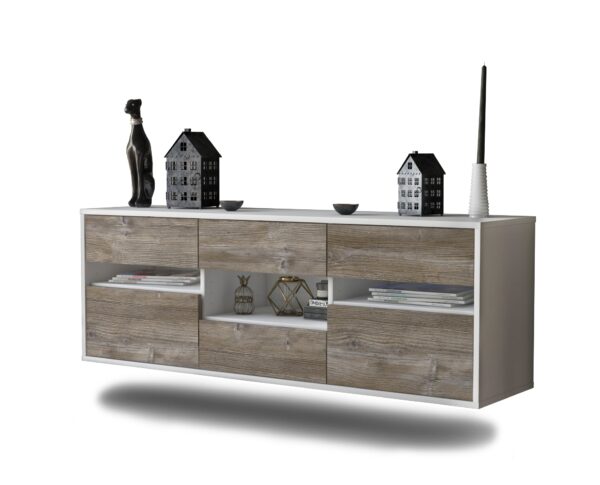 100% Hergestellt in Deutschland und mit Ökostrom produziert. Der Holzschrank überzeugt durch hochwertige Materialien sowie eine erstklassige und saubere Verarbeitung. Der Aufbau des Lowboards gestaltet sich aufgrund der Aufbauanleitung mit grafischen Darstellungen und Illustrationen einfach und schnell. Der Versand erfolgt innerhalb von 2-3 Werktagen. Dieses Lowboard hat Gesamt-Maße von 136x49x35cm. Viel Platz, eine leere Wand, kein passendes Möbelstück? Mit der Gesamtlänge von ca. 1,36 Meter bietet dieser Schrank vielzählige Einsatzmöglichkeiten. Die Holz Front Treibholz Nachbildung ist ein gemütliches, dunkel grau mit einer schönen abgesetzten Holzmaserung. Das rustikale Holz strahlt Ruhe und Geborgenheit aus. Der weiße matte Korpus kann überall integriert werden. Mit der beruhigenden Farbe weiß, findet sich leicht Stellplatz für dieses schöne Möbelstück.