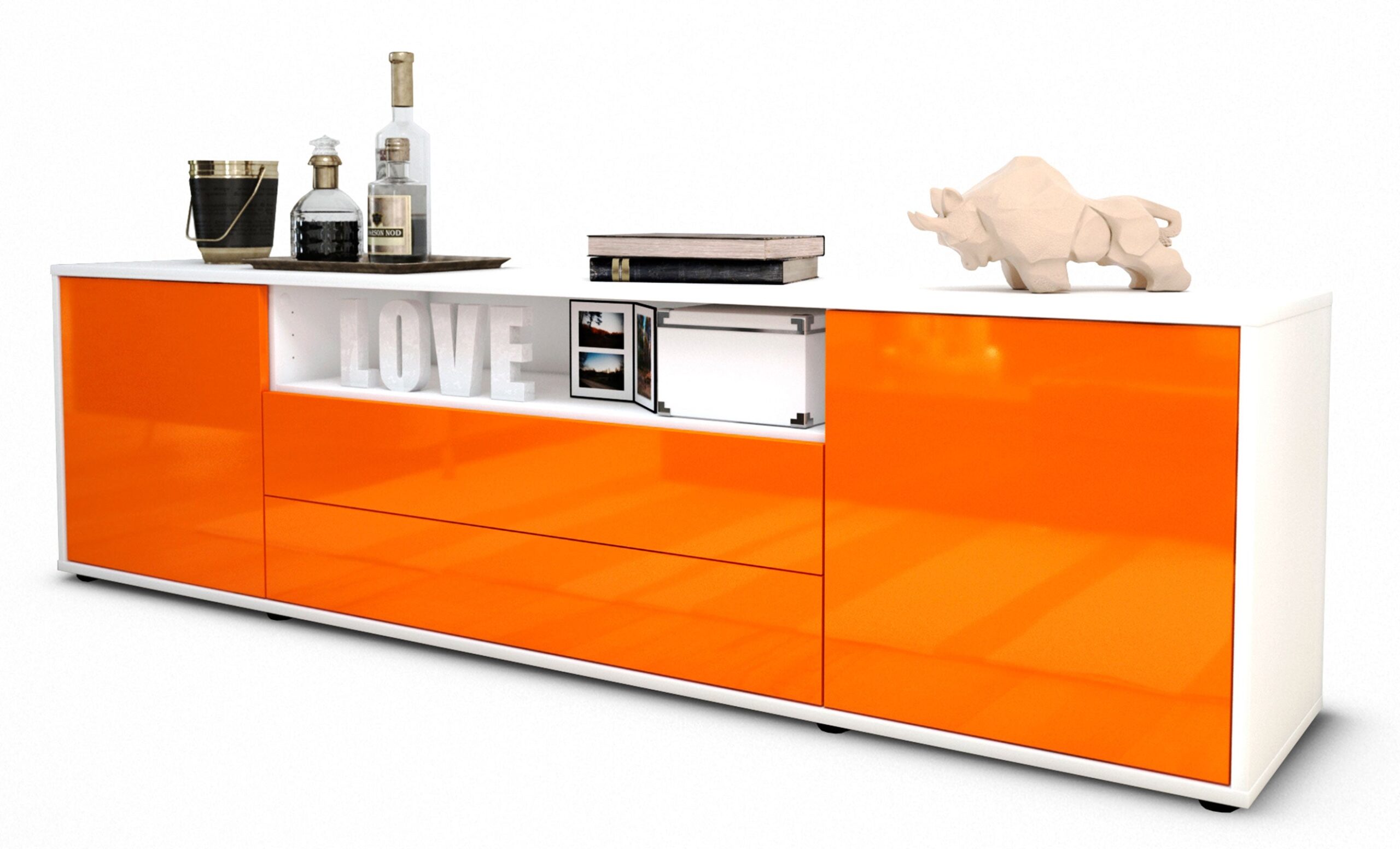 100% Hergestellt in Deutschland und mit Ökostrom produziert. Der Holzschrank überzeugt durch hochwertige Materialien sowie eine erstklassige und saubere Verarbeitung. Der Aufbau des Lowboards gestaltet sich aufgrund der Aufbauanleitung mit grafischen Darstellungen und Illustrationen einfach und schnell. Der Versand erfolgt innerhalb von 2-3 Werktagen. Dieses Lowboard hat Gesamt-Maße von 180x49x35cm. Viel Platz, eine leere Wand, kein passendes Möbelstück? Mit der Gesamtlänge von ca. 1,80 Meter bietet dieser Schrank vielzählige Einsatzmöglichkeiten. Die Frontfarbe Hochglanz Mandarine überzeugt durch ein intensives Orange mit tollem Glanz. Fröhlich und gläzend wird diese Farbe jeden Raum für sich einehmen. Der weiße matte Korpus kann überall integriert werden. Mit der beruhigenden Farbe weiß, findet sich leicht Stellplatz für dieses schöne Möbelstück.