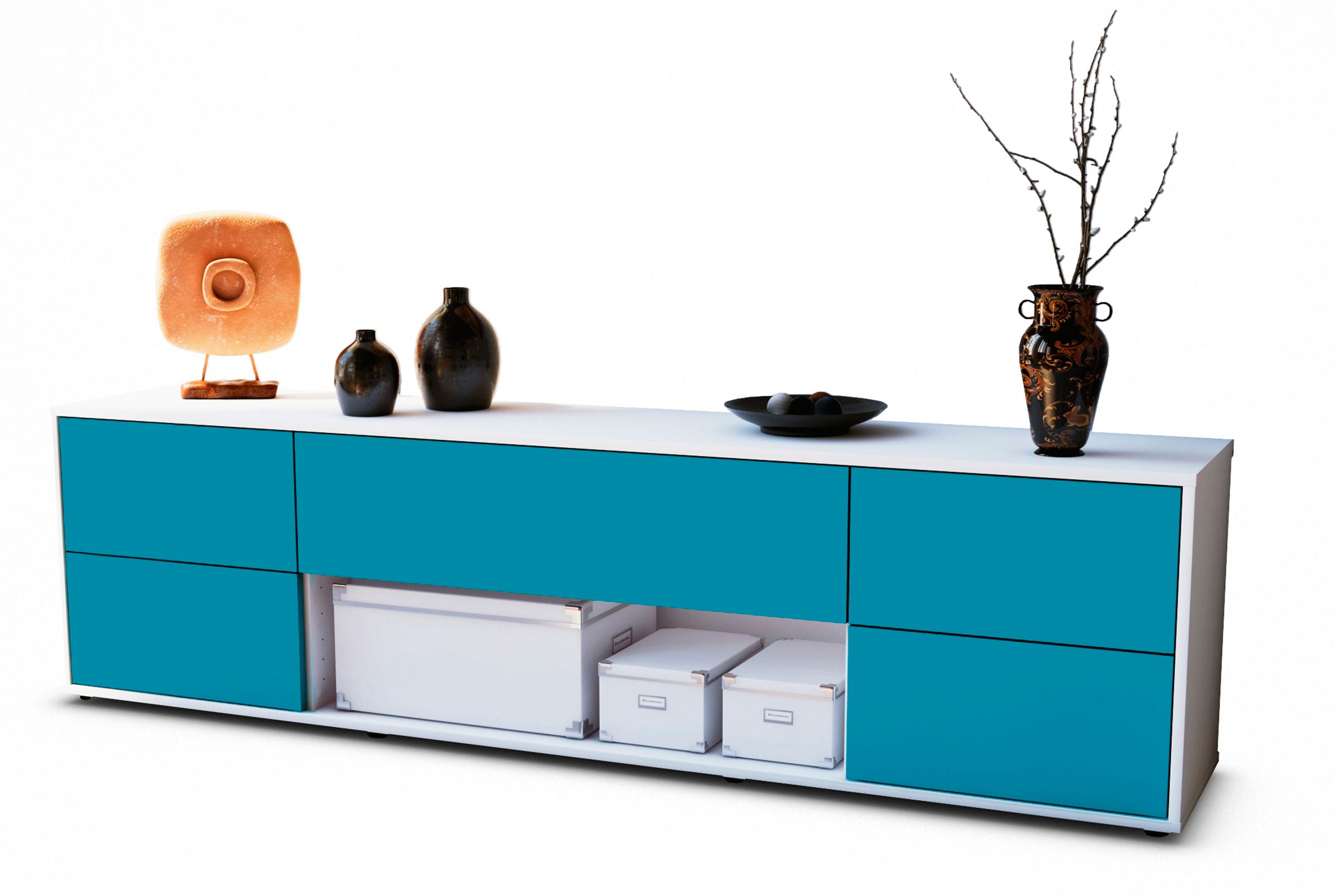 100% Hergestellt in Deutschland und mit Ökostrom produziert. Der Holzschrank überzeugt durch hochwertige Materialien sowie eine erstklassige und saubere Verarbeitung. Der Aufbau des Lowboards gestaltet sich aufgrund der Aufbauanleitung mit grafischen Darstellungen und Illustrationen einfach und schnell. Der Versand erfolgt innerhalb von 2-3 Werktagen. Dieses Lowboard hat Gesamt-Maße von 180x49x35cm. Viel Platz, eine leere Wand, kein passendes Möbelstück? Mit der Gesamtlänge von ca. 1,80 Meter bietet dieser Schrank vielzählige Einsatzmöglichkeiten. Die Frontfarbe im freundlichen Lagunenblau bringt das schöne Wetter in jedes Zuhause. Das intensive Türkis erinnert an die Karibik und schafft tagtägich einen zusätzlichen Erhoungsfaktor. Der weiße matte Korpus kann überall integriert werden. Mit der beruhigenden Farbe weiß, findet sich leicht Stellplatz für dieses schöne Möbelstück.