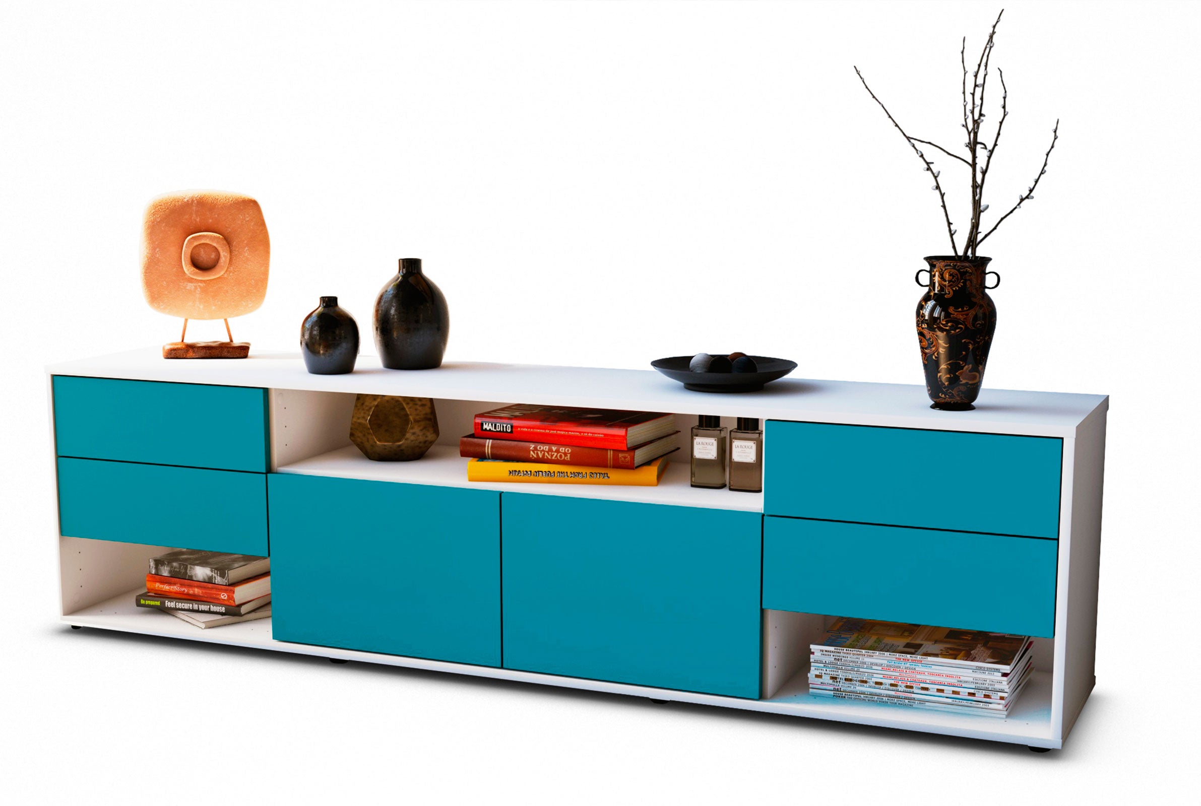 100% Hergestellt in Deutschland und mit Ökostrom produziert. Der Holzschrank überzeugt durch hochwertige Materialien sowie eine erstklassige und saubere Verarbeitung. Der Aufbau des Lowboards gestaltet sich aufgrund der Aufbauanleitung mit grafischen Darstellungen und Illustrationen einfach und schnell. Der Versand erfolgt innerhalb von 2-3 Werktagen. Dieses Lowboard hat Gesamt-Maße von 180x49x35cm. Viel Platz, eine leere Wand, kein passendes Möbelstück? Mit der Gesamtlänge von ca. 1,80 Meter bietet dieser Schrank vielzählige Einsatzmöglichkeiten. Die Frontfarbe im freundlichen Lagunenblau bringt das schöne Wetter in jedes Zuhause. Das intensive Türkis erinnert an die Karibik und schafft tagtägich einen zusätzlichen Erhoungsfaktor. Der weiße matte Korpus kann überall integriert werden. Mit der beruhigenden Farbe weiß, findet sich leicht Stellplatz für dieses schöne Möbelstück.