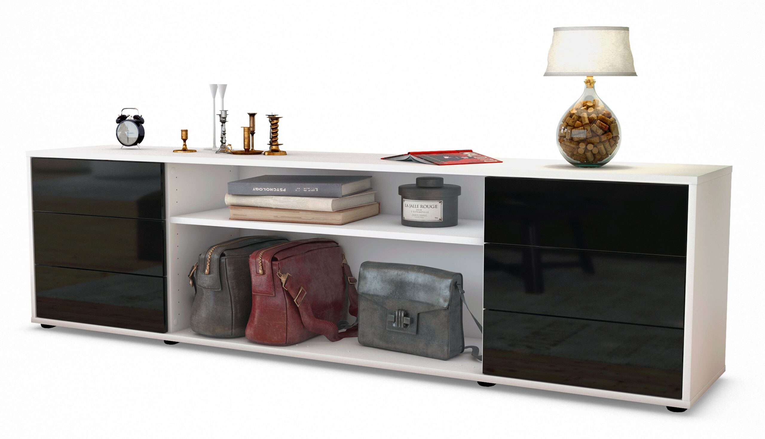 100% Hergestellt in Deutschland und mit Ökostrom produziert. Der Holzschrank überzeugt durch hochwertige Materialien sowie eine erstklassige und saubere Verarbeitung. Der Aufbau des Lowboards gestaltet sich aufgrund der Aufbauanleitung mit grafischen Darstellungen und Illustrationen einfach und schnell. Der Versand erfolgt innerhalb von 2-3 Werktagen. Dieses Lowboard hat Gesamt-Maße von 180x49x35cm. Viel Platz, eine leere Wand, kein passendes Möbelstück? Mit der Gesamtlänge von ca. 1,80 Meter bietet dieser Schrank vielzählige Einsatzmöglichkeiten. Die Frontfarbe Hochglanz Schwarz ist eine der beliebtesten Möbelfarben. Glanz Dekore sind hoch modern und liegen immer im Trend. Die Front ist glänzend und und leicht spiegelnd. Der weiße matte Korpus kann überall integriert werden. Mit der beruhigenden Farbe weiß, findet sich leicht Stellplatz für dieses schöne Möbelstück.
