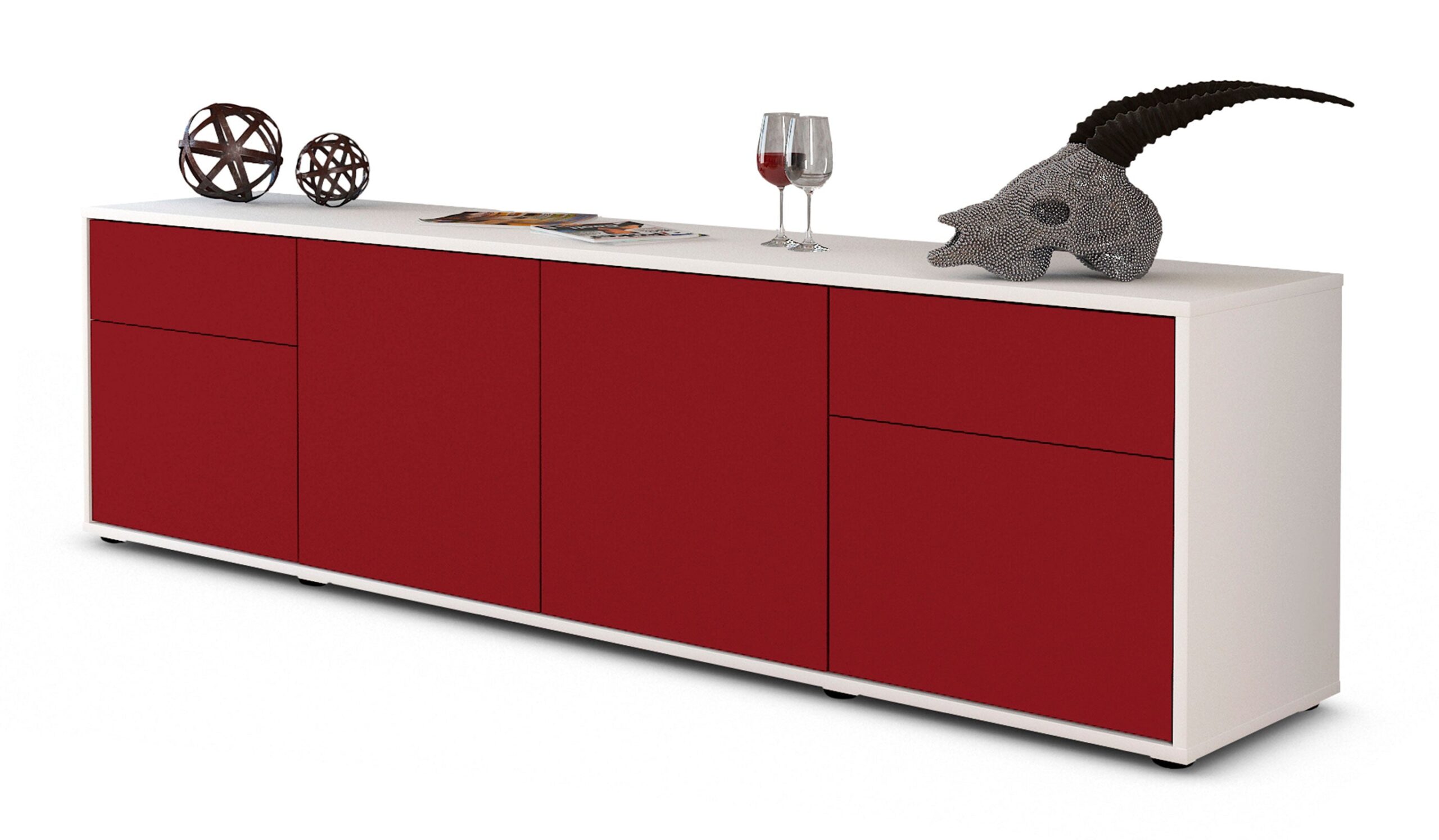 100% Hergestellt in Deutschland und mit Ökostrom produziert. Der Holzschrank überzeugt durch hochwertige Materialien sowie eine erstklassige und saubere Verarbeitung. Der Aufbau des Lowboards gestaltet sich aufgrund der Aufbauanleitung mit grafischen Darstellungen und Illustrationen einfach und schnell. Der Versand erfolgt innerhalb von 2-3 Werktagen. Dieses Lowboard hat Gesamt-Maße von 180x49x35cm. Viel Platz, eine leere Wand, kein passendes Möbelstück? Mit der Gesamtlänge von ca. 1,80 Meter bietet dieser Schrank vielzählige Einsatzmöglichkeiten. Die Frontfarbe dunkles Bordeaux Rot bringt Wärme ins Haus. Das intensive Weinrot ist einer der edelsten Rot Töne und verleiht jeder Einrichtung einen Glamour Faktor.Der weiße matte Korpus kann überall integriert werden. Mit der beruhigenden Farbe weiß, findet sich leicht Stellplatz für dieses schöne Möbelstück.