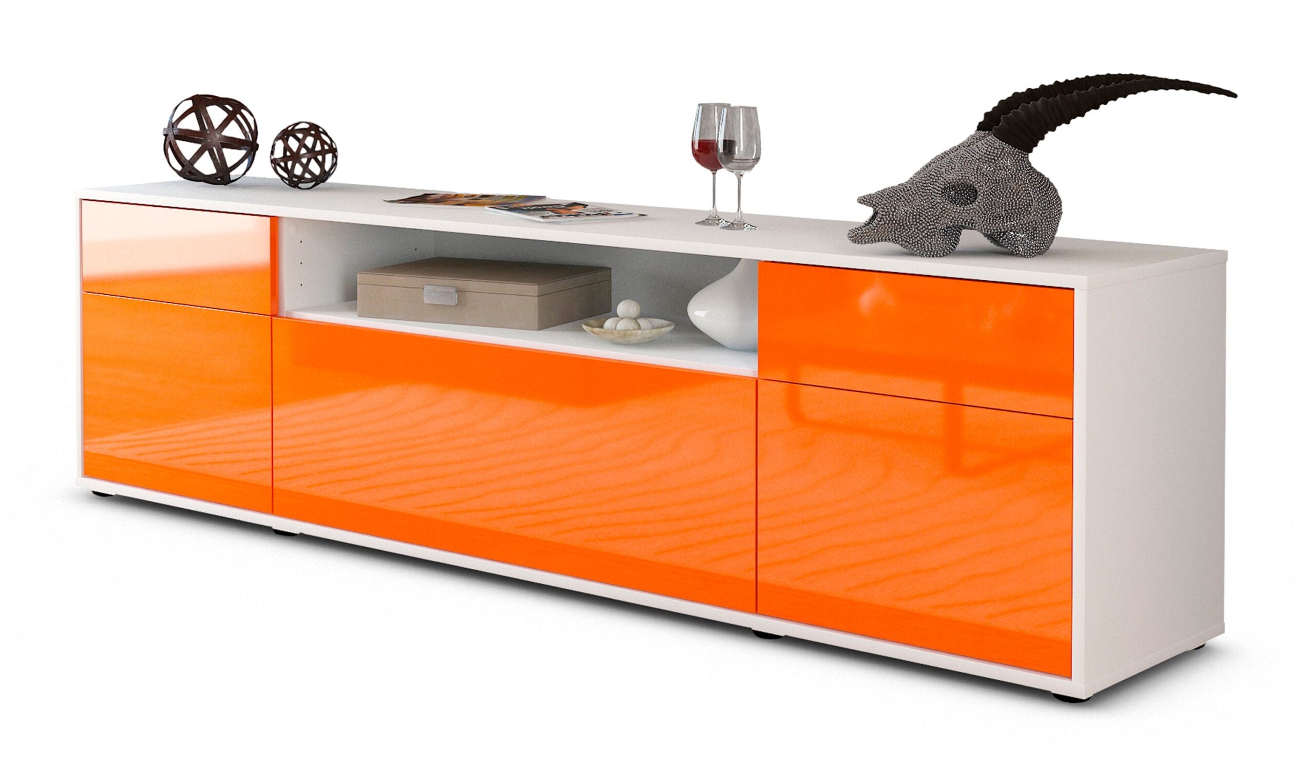 100% Hergestellt in Deutschland und mit Ökostrom produziert. Der Holzschrank überzeugt durch hochwertige Materialien sowie eine erstklassige und saubere Verarbeitung. Der Aufbau des Lowboards gestaltet sich aufgrund der Aufbauanleitung mit grafischen Darstellungen und Illustrationen einfach und schnell. Der Versand erfolgt innerhalb von 2-3 Werktagen. Dieses Lowboard hat Gesamt-Maße von 180x49x35cm. Viel Platz, eine leere Wand, kein passendes Möbelstück? Mit der Gesamtlänge von ca. 1,80 Meter bietet dieser Schrank vielzählige Einsatzmöglichkeiten. Die Frontfarbe Hochglanz Mandarine überzeugt durch ein intensives Orange mit tollem Glanz. Fröhlich und gläzend wird diese Farbe jeden Raum für sich einehmen. Der weiße matte Korpus kann überall integriert werden. Mit der beruhigenden Farbe weiß, findet sich leicht Stellplatz für dieses schöne Möbelstück.