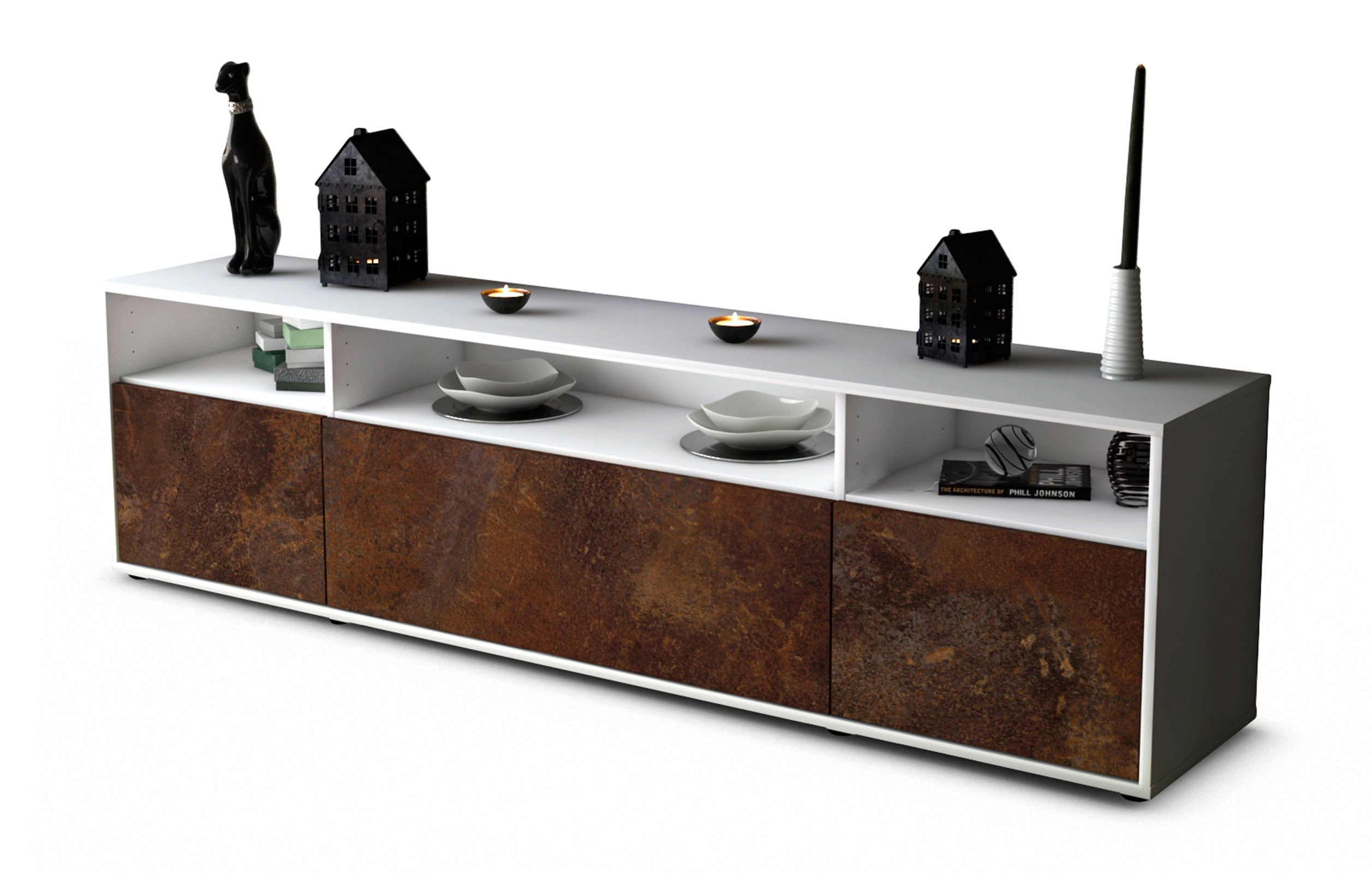 100% Hergestellt in Deutschland und mit Ökostrom produziert. Der Holzschrank überzeugt durch hochwertige Materialien sowie eine erstklassige und saubere Verarbeitung. Der Aufbau des Lowboards gestaltet sich aufgrund der Aufbauanleitung mit grafischen Darstellungen und Illustrationen einfach und schnell. Der Versand erfolgt innerhalb von 2-3 Werktagen. Dieses Lowboard hat Gesamt-Maße von 180x49x35cm. Viel Platz, eine leere Wand, kein passendes Möbelstück? Mit der Gesamtlänge von ca. 1,80 Meter bietet dieser Schrank vielzählige Einsatzmöglichkeiten. Die Frontfarbe Rost wirkt antik und verleiht einen Retro Industrie-Look. Die Darstellung von alten, verwitterten oder verrosteten Metall / Eisen wirkt Rot-Braun bzw. Bronze-Farben. Der weiße matte Korpus kann überall integriert werden. Mit der beruhigenden Farbe weiß, findet sich leicht Stellplatz für dieses schöne Möbelstück.