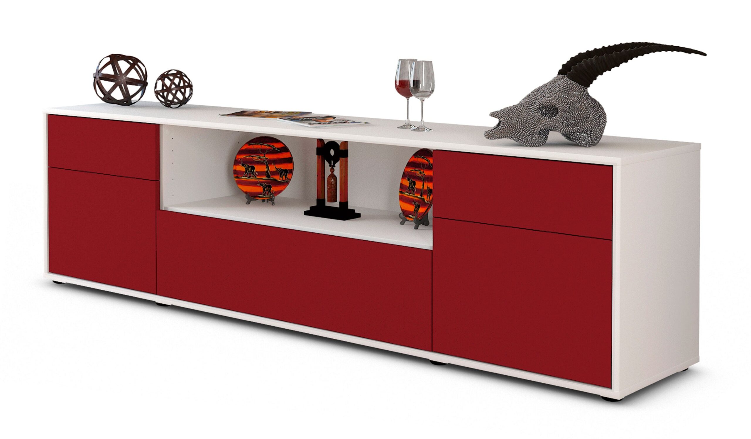100% Hergestellt in Deutschland und mit Ökostrom produziert. Der Holzschrank überzeugt durch hochwertige Materialien sowie eine erstklassige und saubere Verarbeitung. Der Aufbau des Lowboards gestaltet sich aufgrund der Aufbauanleitung mit grafischen Darstellungen und Illustrationen einfach und schnell. Der Versand erfolgt innerhalb von 2-3 Werktagen. Dieses Lowboard hat Gesamt-Maße von 180x49x35cm. Viel Platz, eine leere Wand, kein passendes Möbelstück? Mit der Gesamtlänge von ca. 1,80 Meter bietet dieser Schrank vielzählige Einsatzmöglichkeiten. Die Frontfarbe dunkles Bordeaux Rot bringt Wärme ins Haus. Das intensive Weinrot ist einer der edelsten Rot Töne und verleiht jeder Einrichtung einen Glamour Faktor.Der weiße matte Korpus kann überall integriert werden. Mit der beruhigenden Farbe weiß, findet sich leicht Stellplatz für dieses schöne Möbelstück.