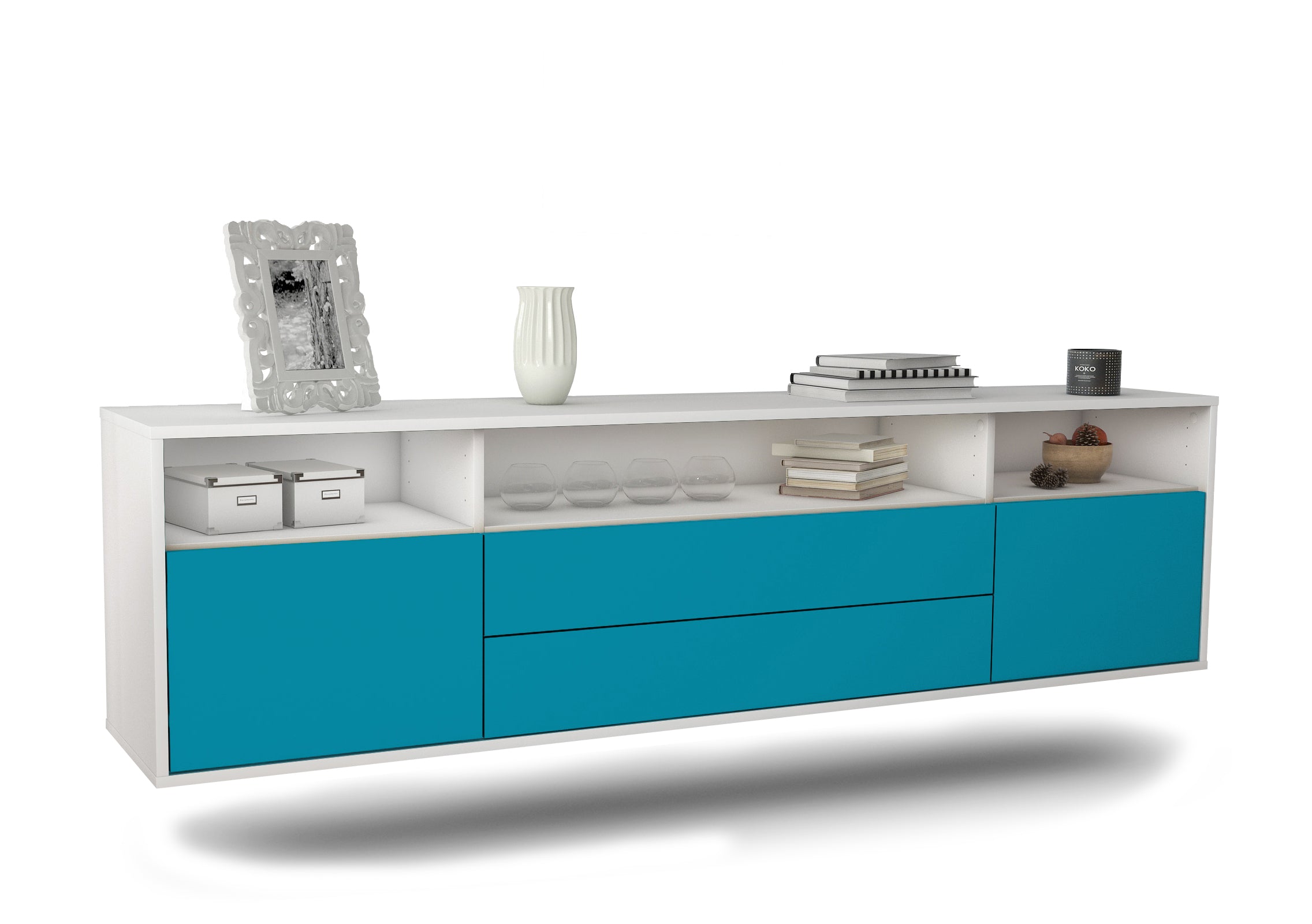 100% Hergestellt in Deutschland und mit Ökostrom produziert. Der Holzschrank überzeugt durch hochwertige Materialien sowie eine erstklassige und saubere Verarbeitung. Der Aufbau des Lowboards gestaltet sich aufgrund der Aufbauanleitung mit grafischen Darstellungen und Illustrationen einfach und schnell. Der Versand erfolgt innerhalb von 2-3 Werktagen. Dieses Lowboard hat Gesamt-Maße von 180x49x35cm. Viel Platz, eine leere Wand, kein passendes Möbelstück? Mit der Gesamtlänge von ca. 1,80 Meter bietet dieser Schrank vielzählige Einsatzmöglichkeiten. Die Frontfarbe im freundlichen Lagunenblau bringt das schöne Wetter in jedes Zuhause. Das intensive Türkis erinnert an die Karibik und schafft tagtägich einen zusätzlichen Erhoungsfaktor. Der weiße matte Korpus kann überall integriert werden. Mit der beruhigenden Farbe weiß, findet sich leicht Stellplatz für dieses schöne Möbelstück.