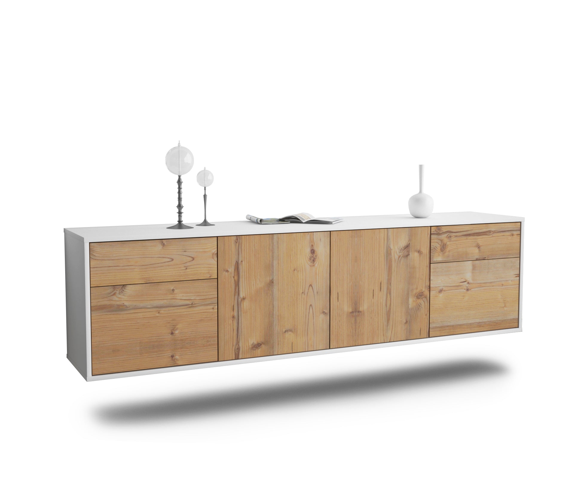 100% Hergestellt in Deutschland und mit Ökostrom produziert. Der Holzschrank überzeugt durch hochwertige Materialien sowie eine erstklassige und saubere Verarbeitung. Der Aufbau des Lowboards gestaltet sich aufgrund der Aufbauanleitung mit grafischen Darstellungen und Illustrationen einfach und schnell. Der Versand erfolgt innerhalb von 2-3 Werktagen. Dieses Lowboard hat Gesamt-Maße von 180x49x35cm. Viel Platz, eine leere Wand, kein passendes Möbelstück? Mit der Gesamtlänge von ca. 1,80 Meter bietet dieser Schrank vielzählige Einsatzmöglichkeiten. Die Holz Front Pinie Nachbildung ist ein freundliches Braun mit farblich abgesetzter Holzmaserung. Die Integrierung in Wohnräume ist durch das warme Holz leicht möglich. Der weiße matte Korpus kann überall integriert werden. Mit der beruhigenden Farbe weiß, findet sich leicht Stellplatz für dieses schöne Möbelstück.