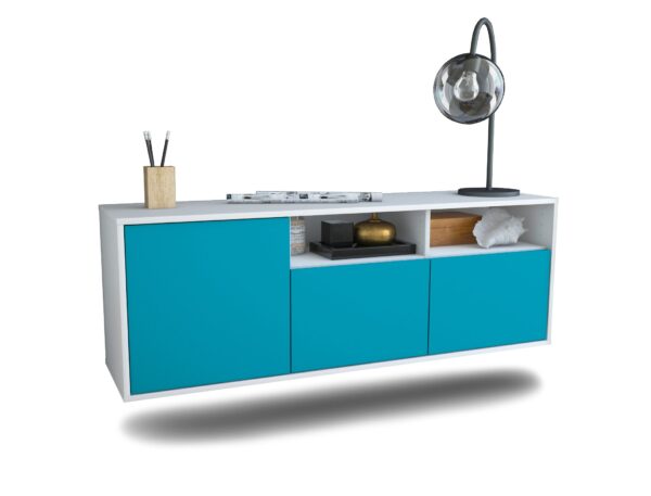 100% Hergestellt in Deutschland und mit Ökostrom produziert. Der Holzschrank überzeugt durch hochwertige Materialien sowie eine erstklassige und saubere Verarbeitung. Der Aufbau des Lowboards gestaltet sich aufgrund der Aufbauanleitung mit grafischen Darstellungen und Illustrationen einfach und schnell. Der Versand erfolgt innerhalb von 2-3 Werktagen. Dieses Lowboard hat Gesamt-Maße von 136x49x35cm. Viel Platz, eine leere Wand, kein passendes Möbelstück? Mit der Gesamtlänge von ca. 1,36 Meter bietet dieser Schrank vielzählige Einsatzmöglichkeiten. Die Frontfarbe im freundlichen Lagunenblau bringt das schöne Wetter in jedes Zuhause. Das intensive Türkis erinnert an die Karibik und schafft tagtägich einen zusätzlichen Erhoungsfaktor. Der weiße matte Korpus kann überall integriert werden. Mit der beruhigenden Farbe weiß, findet sich leicht Stellplatz für dieses schöne Möbelstück.