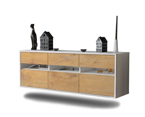 100% Hergestellt in Deutschland und mit Ökostrom produziert. Der Holzschrank überzeugt durch hochwertige Materialien sowie eine erstklassige und saubere Verarbeitung. Der Aufbau des Lowboards gestaltet sich aufgrund der Aufbauanleitung mit grafischen Darstellungen und Illustrationen einfach und schnell. Der Versand erfolgt innerhalb von 2-3 Werktagen. Dieses Lowboard hat Gesamt-Maße von 136x49x35cm. Viel Platz, eine leere Wand, kein passendes Möbelstück? Mit der Gesamtlänge von ca. 1,36 Meter bietet dieser Schrank vielzählige Einsatzmöglichkeiten. Die Holz Front Eiche Nachbildung überzeugt mit einem warmen, intensiven Braun sowie einer auffälligen Holzmaserung und sorgt mit seiner gelblichen Holzoptik für eine rustikale Gemütlichkeit. Der weiße matte Korpus kann überall integriert werden. Mit der beruhigenden Farbe weiß, findet sich leicht Stellplatz für dieses schöne Möbelstück.