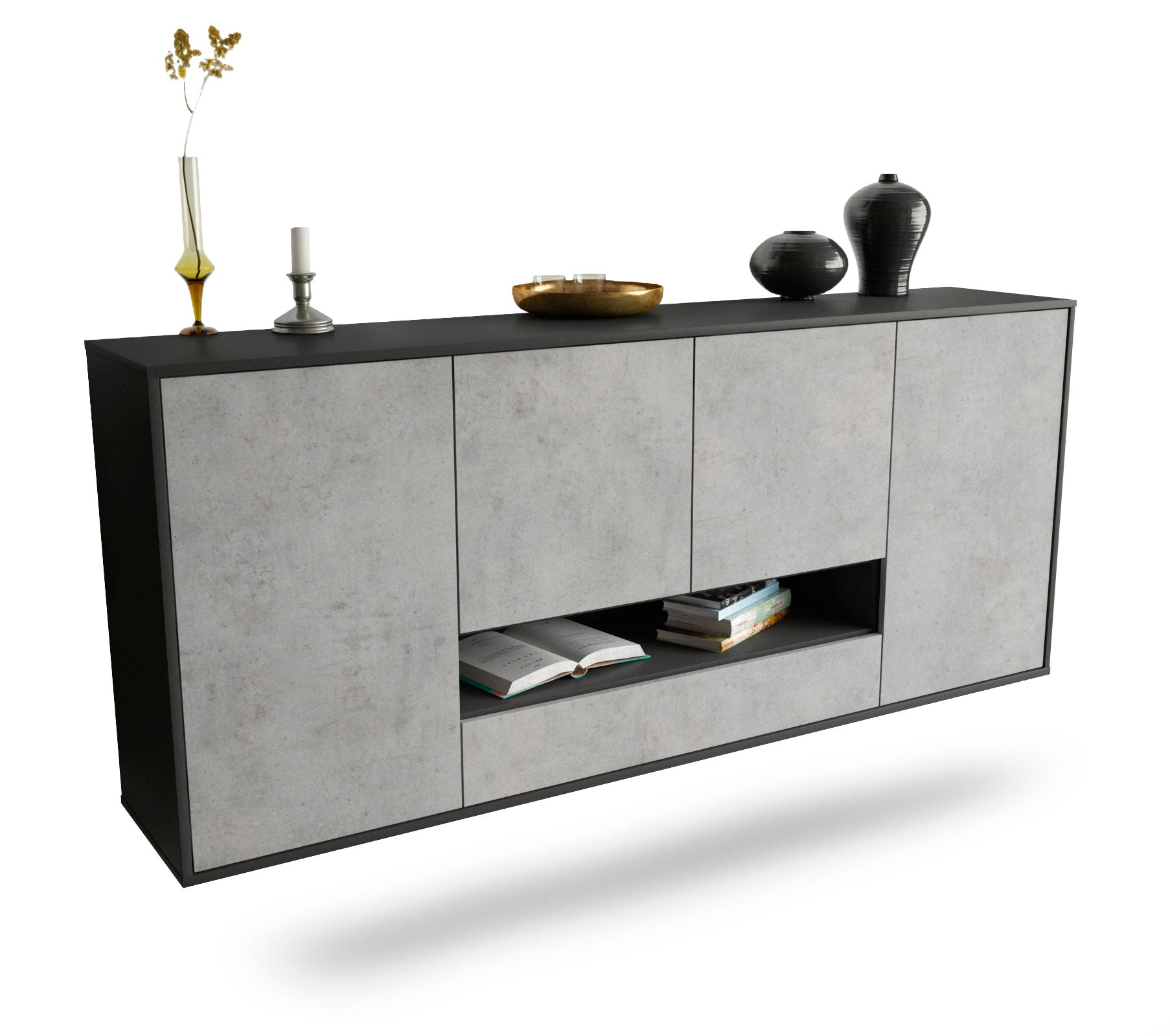 Dieses Sideboard hat Gesamt-Maße von 180x79x35cm. Viel Platz, eine leere Wand, kein passendes Möbelstück? Unsere 1,80 m lange Kommode ist die perfekte Lösung! Die Frontfarbe Beton wirkt zeitlos und hoch modern. Die steinähnliche Nachbildung zeigt sich als klassisch, stilvolles Grau meliert. Die Betonoptik im Industrie-Look liegt gerade voll im Trend. Der anthrazit-matte Korpus harmoniert mit allen Farben und wirkt besonders edel im Kontrast zu hellen Wänden.