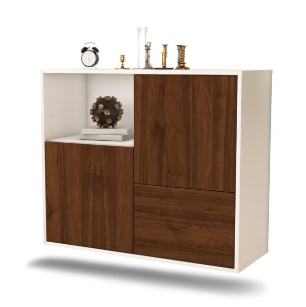 Dieses Sideboard hat Gesamt-Maße von 92x79x35cm. Viel Platz, eine leere Wand, kein passendes Möbelstück? Unsere 92 cm lange Kommode ist die perfekte Lösung! Die Holz Front Walnuss Nachbildung wirkt mit einem dunklen und intensiven Braun sehr einladend. Das dunkel erscheinende Holz passt sehr gut zu einem gemütlichen Einrichtungsstil. Der weiße matte Korpus kann überall integriert werden. Mit der beruhigenden Farbe weiß, findet sich leicht Stellplatz für dieses schöne Möbelstück.