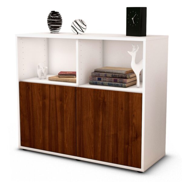 Dieses Sideboard hat Gesamt-Maße von 92x79x35cm. Viel Platz, eine leere Wand, kein passendes Möbelstück? Unsere 92 cm lange Kommode ist die perfekte Lösung! Die Holz Front Walnuss Nachbildung wirkt mit einem dunklen und intensiven Braun sehr einladend. Das dunkel erscheinende Holz passt sehr gut zu einem gemütlichen Einrichtungsstil. Der weiße matte Korpus kann überall integriert werden. Mit der beruhigenden Farbe weiß, findet sich leicht Stellplatz für dieses schöne Möbelstück.