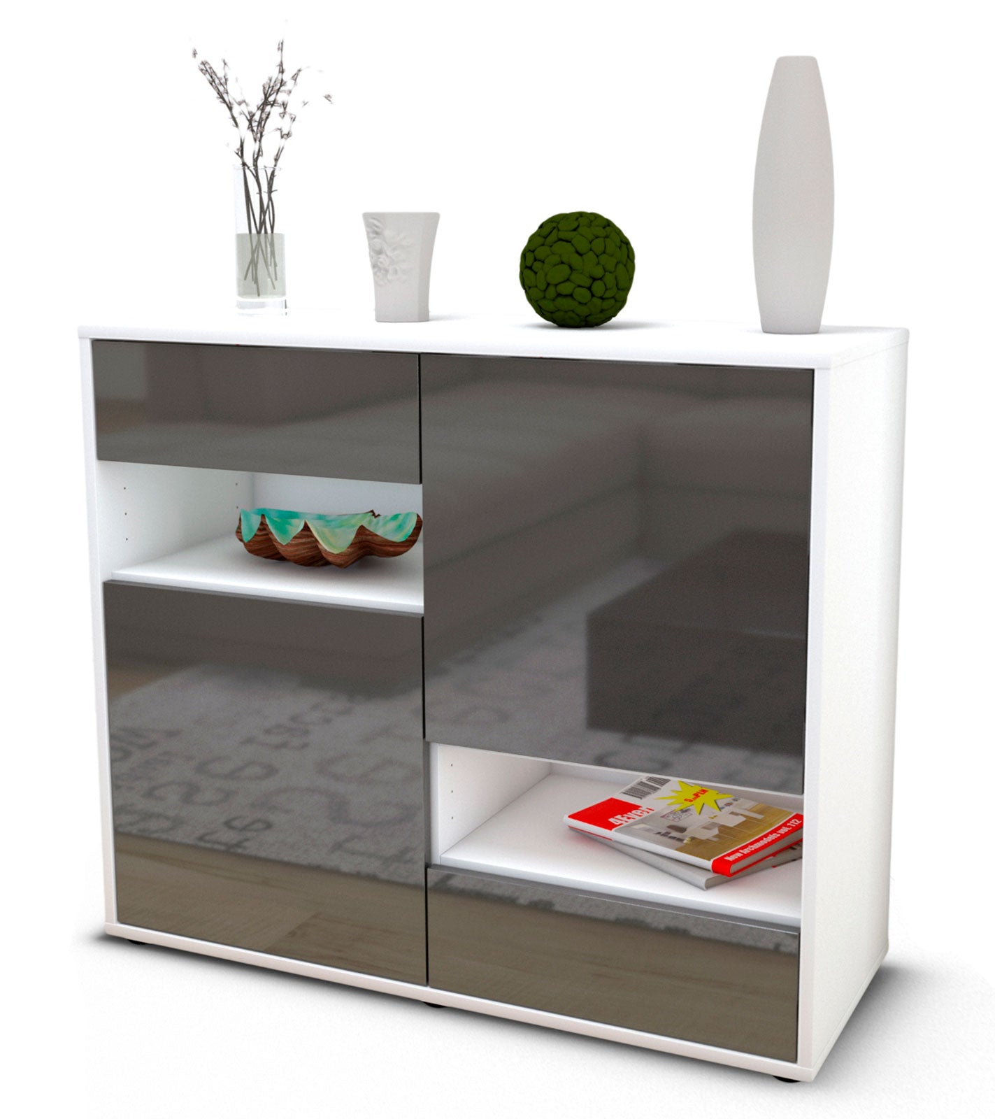 Dieses Sideboard hat Gesamt-Maße von 92x79x35cm. Viel Platz, eine leere Wand, kein passendes Möbelstück? Unsere 92 cm lange Kommode ist die perfekte Lösung! Die Frontfarbe Hochglanz Graphit Grau ist zeitlos, schlicht und daher für jeden Wohnbereich glänzend geeignet. Anthrazit, dunkelgrau oder granit – diese Farbtöne bringen Stil & Glanz. Der weiße matte Korpus kann überall integriert werden. Mit der beruhigenden Farbe weiß, findet sich leicht Stellplatz für dieses schöne Möbelstück.