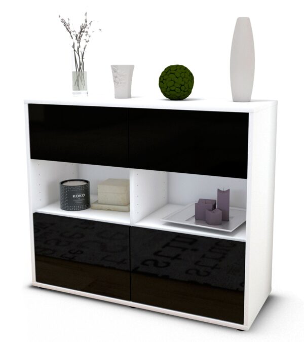 Dieses Sideboard hat Gesamt-Maße von 92x79x35cm. Viel Platz, eine leere Wand, kein passendes Möbelstück? Unsere 92 cm lange Kommode ist die perfekte Lösung! Die Frontfarbe Hochglanz Schwarz ist eine der beliebtesten Möbelfarben. Glanz Dekore sind hoch modern und liegen immer im Trend. Die Front ist glänzend und und leicht spiegelnd. Der weiße matte Korpus kann überall integriert werden. Mit der beruhigenden Farbe weiß, findet sich leicht Stellplatz für dieses schöne Möbelstück.