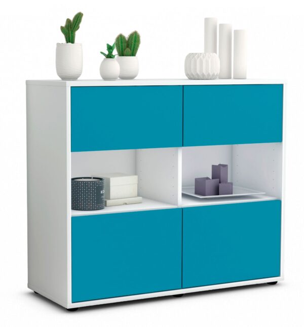 Dieses Sideboard hat Gesamt-Maße von 92x79x35cm. Viel Platz, eine leere Wand, kein passendes Möbelstück? Unsere 92 cm lange Kommode ist die perfekte Lösung! Die Frontfarbe im freundlichen Lagunenblau bringt das schöne Wetter in jedes Zuhause. Das intensive Türkis erinnert an die Karibik und schafft tagtägich einen zusätzlichen Erhoungsfaktor. Der weiße matte Korpus kann überall integriert werden. Mit der beruhigenden Farbe weiß, findet sich leicht Stellplatz für dieses schöne Möbelstück.