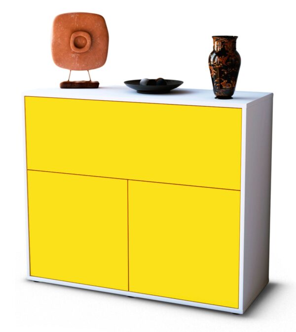 Dieses Sideboard hat Gesamt-Maße von 92x79x35cm. Viel Platz, eine leere Wand, kein passendes Möbelstück? Unsere 92 cm lange Kommode ist die perfekte Lösung! Die Frontfarbe Sonnengelb verleiht Räumen Freude und positive Energie ohne diesen farblich zu überfluten. Der eher gelb pastell Ton verschafft eine frische Atmosphäre.Der weiße matte Korpus kann überall integriert werden. Mit der beruhigenden Farbe weiß, findet sich leicht Stellplatz für dieses schöne Möbelstück.
