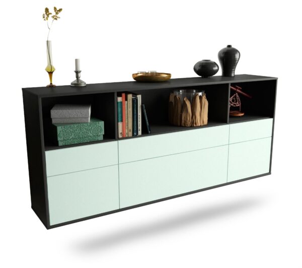 Dieses Sideboard hat Gesamt-Maße von 180x79x35cm. Viel Platz, eine leere Wand, kein passendes Möbelstück? Unsere 1,80 m lange Kommode ist die perfekte Lösung! Die Frontfarbe Eisblau verleiht Ihrem Raum Frische. Das Himmelblau fördert eine sanfte Atmosphäre. Die Farben Hellblau und Mint werden gerne für moderne Wohnräume verwendet. Der anthrazit-matte Korpus harmoniert mit allen Farben und wirkt besonders edel im Kontrast zu hellen Wänden.