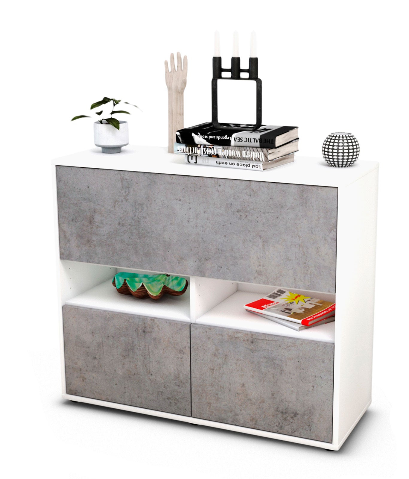 Dieses Sideboard hat Gesamt-Maße von 92x79x35cm. Viel Platz, eine leere Wand, kein passendes Möbelstück? Unsere 92 cm lange Kommode ist die perfekte Lösung! Die Frontfarbe Beton wirkt zeitlos und hoch modern. Die steinähnliche Nachbildung zeigt sich als klassisch, stilvolles Grau meliert. Die Betonoptik im Industrie-Look liegt gerade voll im Trend. Der weiße matte Korpus kann überall integriert werden. Mit der beruhigenden Farbe weiß, findet sich leicht Stellplatz für dieses schöne Möbelstück.