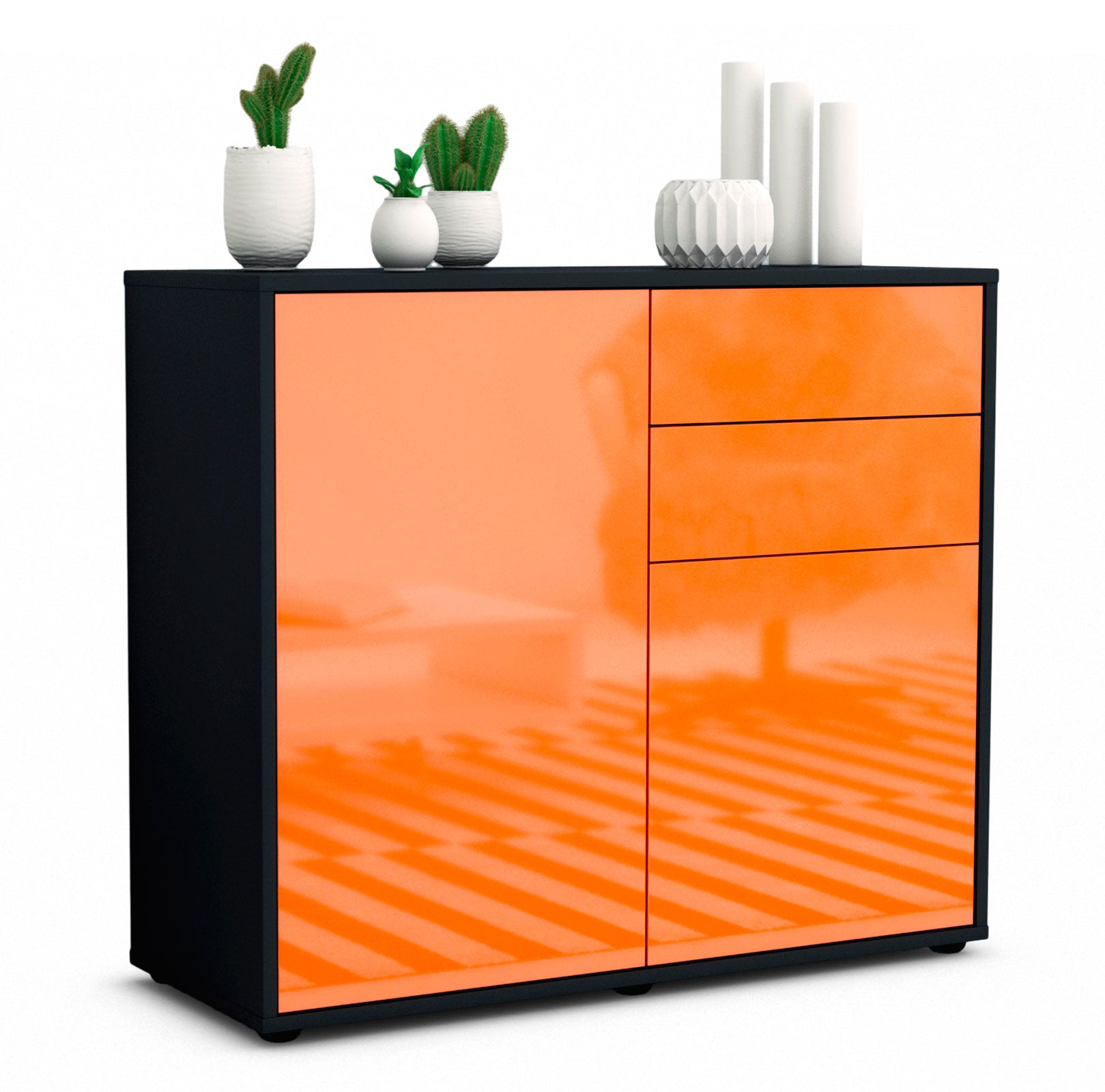 Dieses Sideboard hat Gesamt-Maße von 92x79x35cm. Viel Platz, eine leere Wand, kein passendes Möbelstück? Unsere 92 cm lange Kommode ist die perfekte Lösung! Die Frontfarbe Hochglanz Mandarine überzeugt durch ein intensives Orange mit tollem Glanz. Fröhlich und gläzend wird diese Farbe jeden Raum für sich einehmen. Der anthrazit-matte Korpus harmoniert mit allen Farben und wirkt besonders edel im Kontrast zu hellen Wänden.