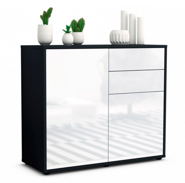 Dieses Sideboard hat Gesamt-Maße von 92x79x35cm. Viel Platz, eine leere Wand, kein passendes Möbelstück? Unsere 92 cm lange Kommode ist die perfekte Lösung! Die Frontfarbe Hochglanz Weiß bringt als reine und unschuldige Farbe Ruhe in jeden Raum. Mit dem Glanz Weiss erzeugt man einen hochwertigen glänzenden Kontrast zu dunklen Wänden. Der anthrazit-matte Korpus harmoniert mit allen Farben und wirkt besonders edel im Kontrast zu hellen Wänden.